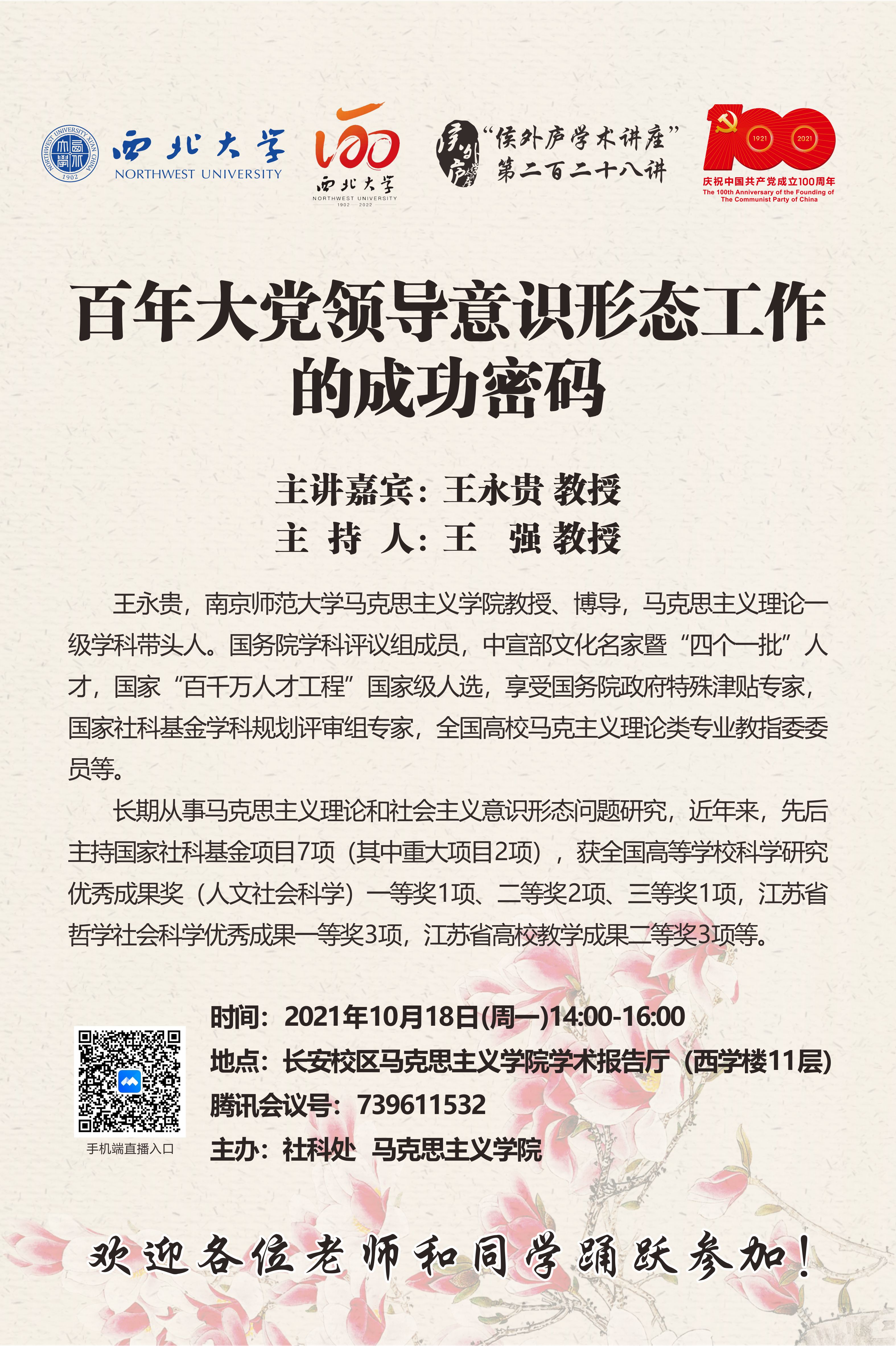 王永贵 “侯外庐学术讲座”第二百二十八讲:百年大党领导意识形态工作的成功密码 讲座时间 2021年10月18日(周一)14:00-16:00 讲座地点 长安校区马克思主义学院学术报告厅(西学楼11层) 讲座人介绍 王永贵 讲座内容