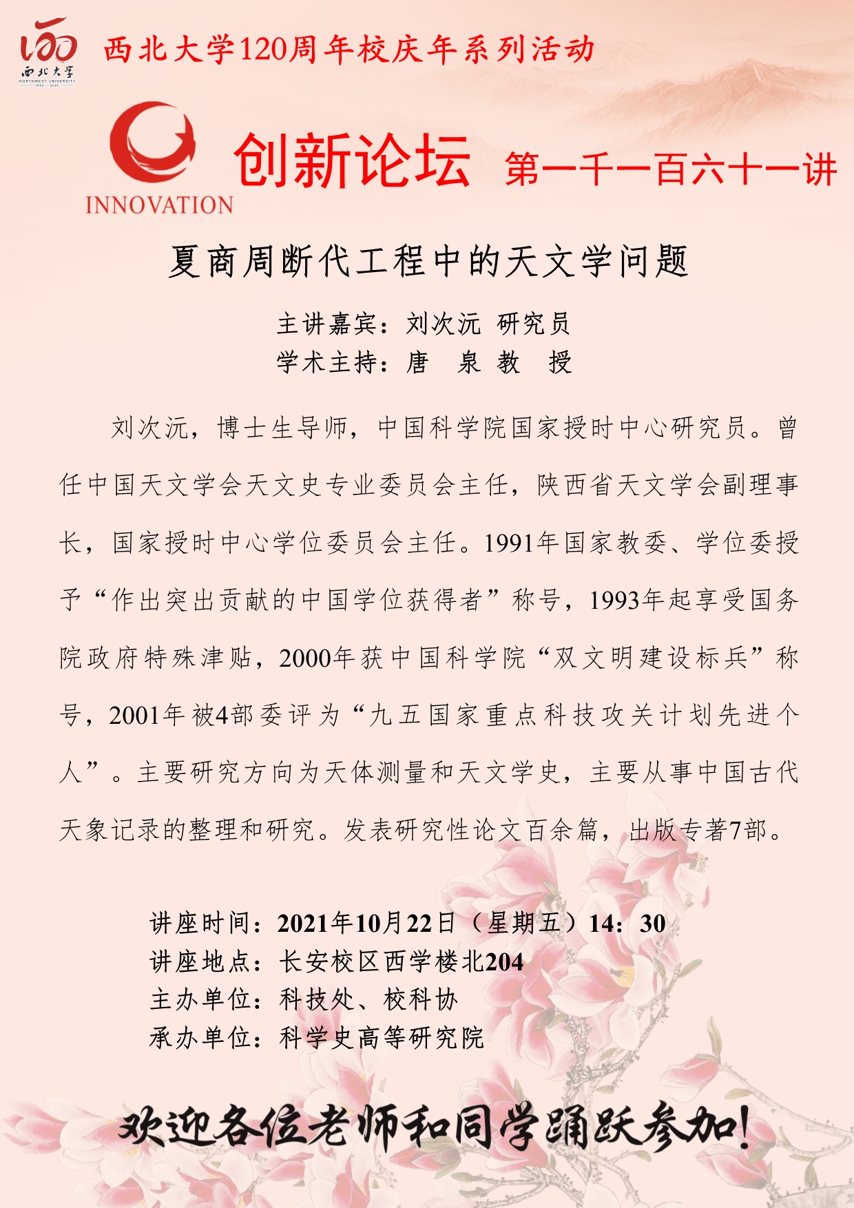刘次沅 研究员 星空app官网创新论坛第一千一百六十一讲暨120周年校庆年系列活动:夏商周断代工程中的天文学问题 讲座时间 2021年10月22日(星期五)14:30 讲座地点 长安校区西学楼北204 讲座人介绍 刘次沅 研究员 讲座内容
