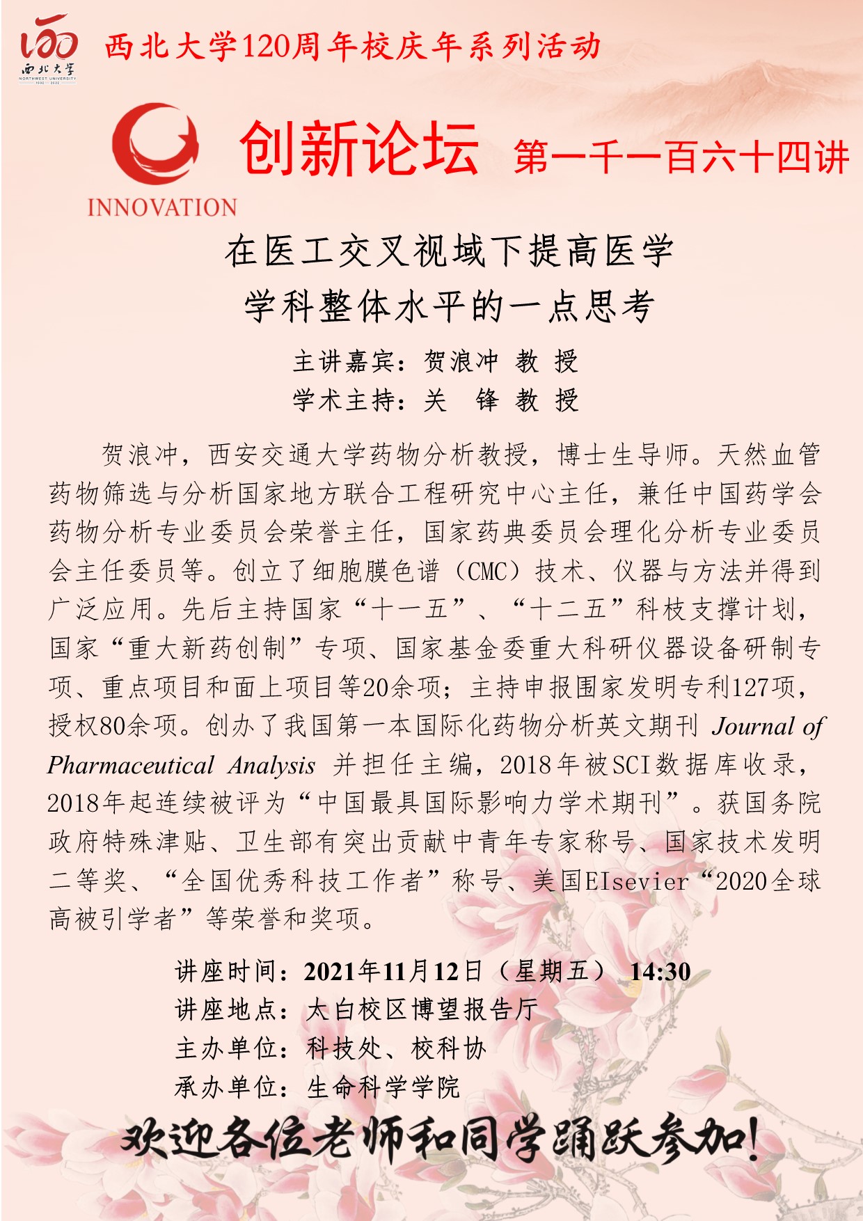 贺浪冲 教授 星空app官网创新论坛第一千一百六十四讲暨120周年校庆年系列活动:在医工交叉视域下提高医学学科整体水平的一点思考 讲座时间 2021年11月12日(星期五) 14:30 讲座地点 太白校区博望报告厅 讲座人介绍 贺浪冲 教授 讲座内容