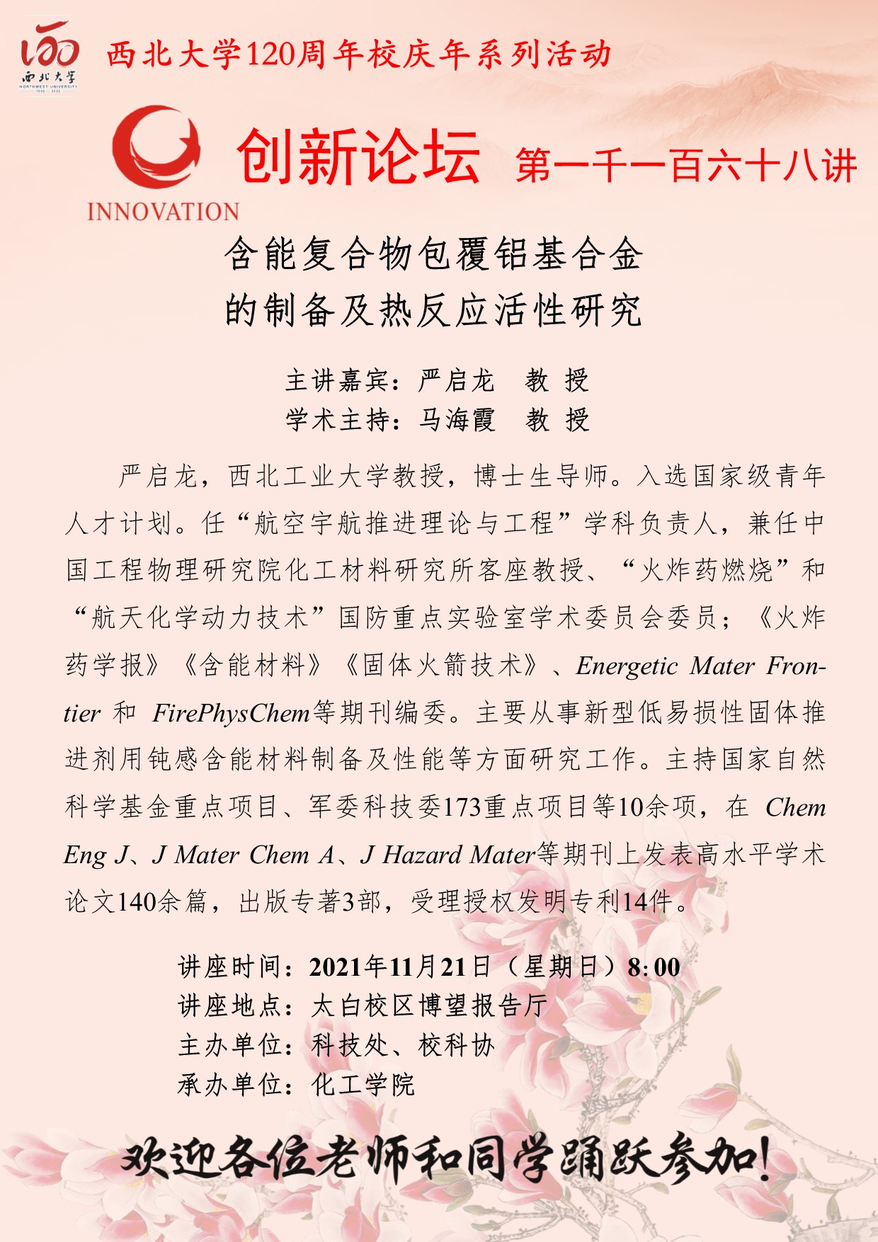 严启龙 教授 星空app官网创新论坛第一千一百六十八讲暨120周年校庆年系列活动:含能复合物包覆铝基合金的制备及热反应活性研究 讲座时间 2021年11月21日(星期日)8:00 讲座地点 太白校区博望报告厅 讲座人介绍 严启龙 教授 讲座内容