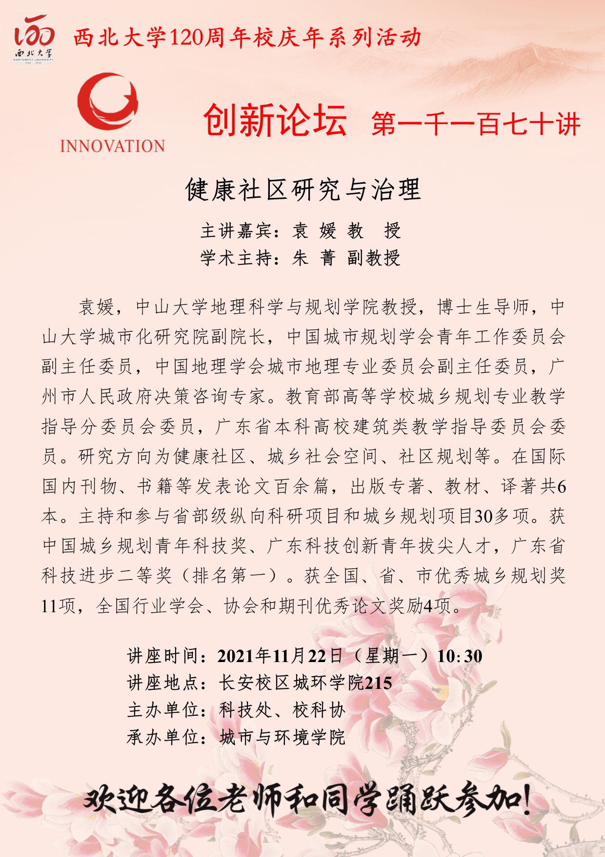 袁媛 教授 星空app官网创新论坛第一千一百七十讲暨120周年校庆年系列活动:健康社区研究与治理 讲座时间 2021年11月22日(星期一)10:30 讲座地点 长安校区城环学院215 讲座人介绍 袁媛 教授 讲座内容