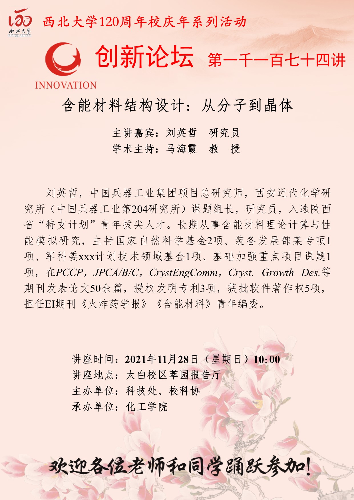 刘英哲 研究员 星空app官网创新论坛第一千一百七十四讲暨120周年校庆年系列活动:含能材料结构设计: 从分子到晶体 讲座时间 2021年11月28日(星期日)10:00 讲座地点 太白校区萃园报告厅 讲座人介绍 刘英哲 研究员 讲座内容