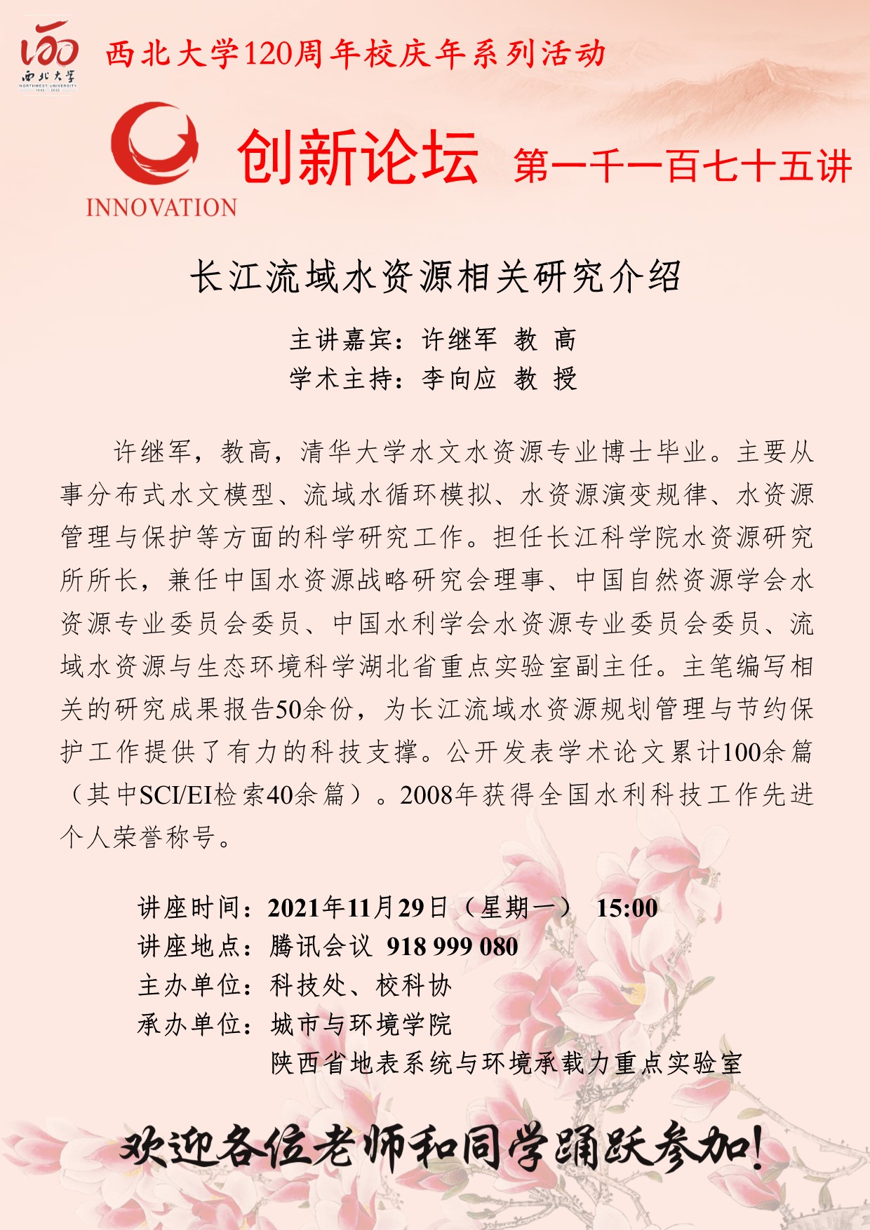 许继军 教高 星空app官网创新论坛第一千一百七十五讲暨120周年校庆年系列活动:长江流域水资源相关研究介绍 讲座时间 2021年11月29日(星期一) 15:00 讲座地点 腾讯会议:918999080 讲座人介绍 许继军 教高 讲座内容