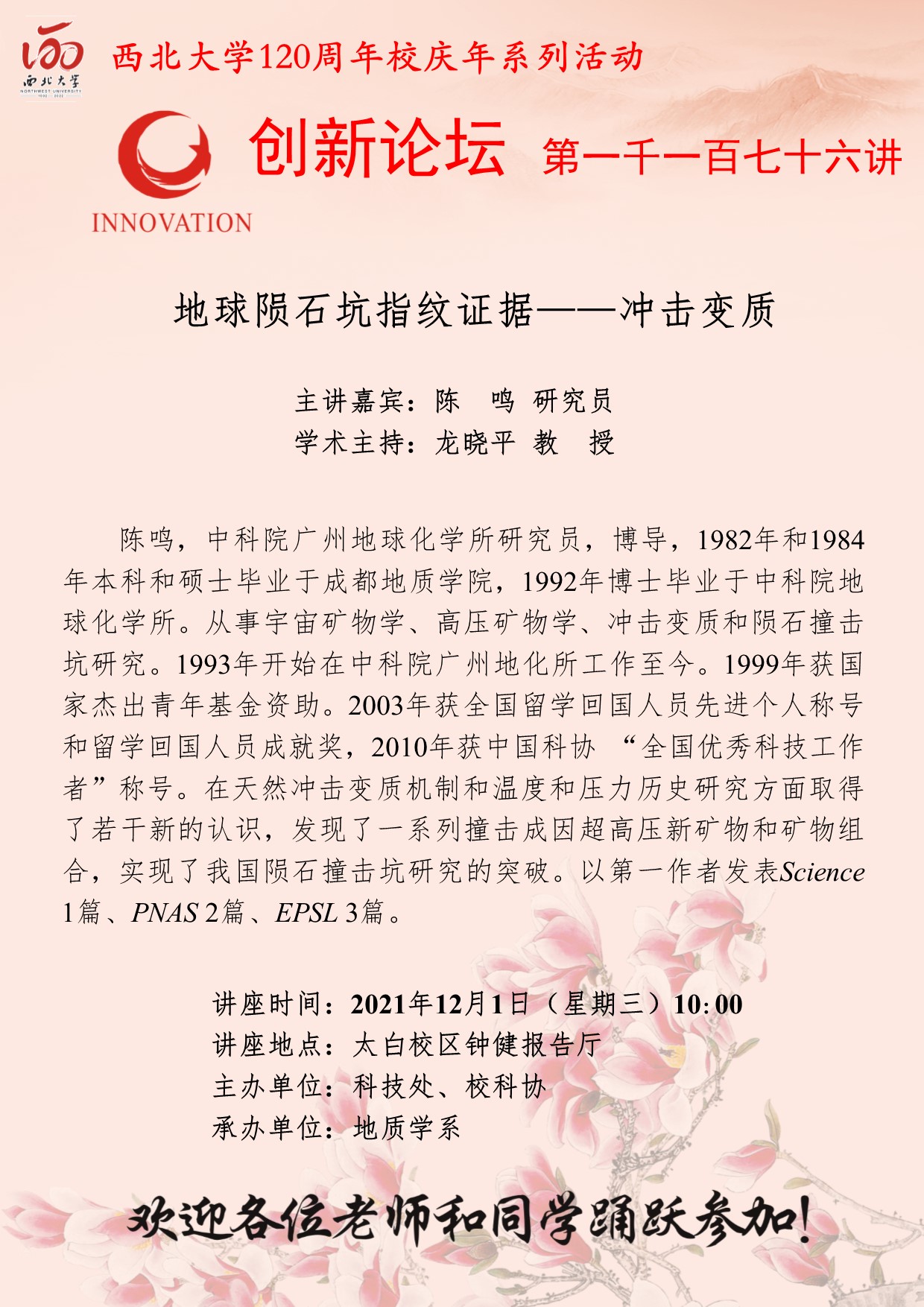 陈鸣 研究员 星空app官网创新论坛第一千一百七十六讲暨120周年校庆年系列活动:地球陨石坑指纹证据——冲击变质 讲座时间 2021年12月1日(星期三)10:00 讲座地点 太白校区钟健报告厅 讲座人介绍 陈鸣 研究员 讲座内容