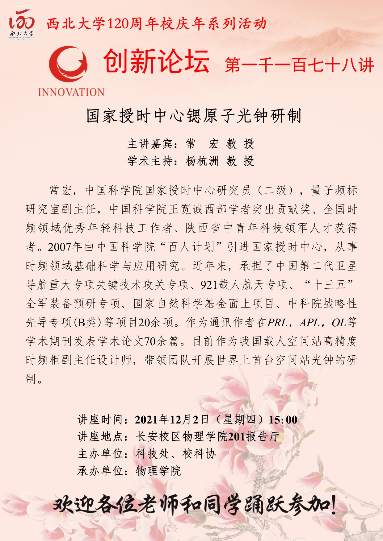 常宏 教授 星空app官网创新论坛第一千一百七十八讲暨120周年校庆年系列活动:国家授时中心锶原子光钟研制 讲座时间 2021年12月2日(星期四)15:00 讲座地点 长安校区物理学院201报告厅 讲座人介绍 常宏 教授 讲座内容
