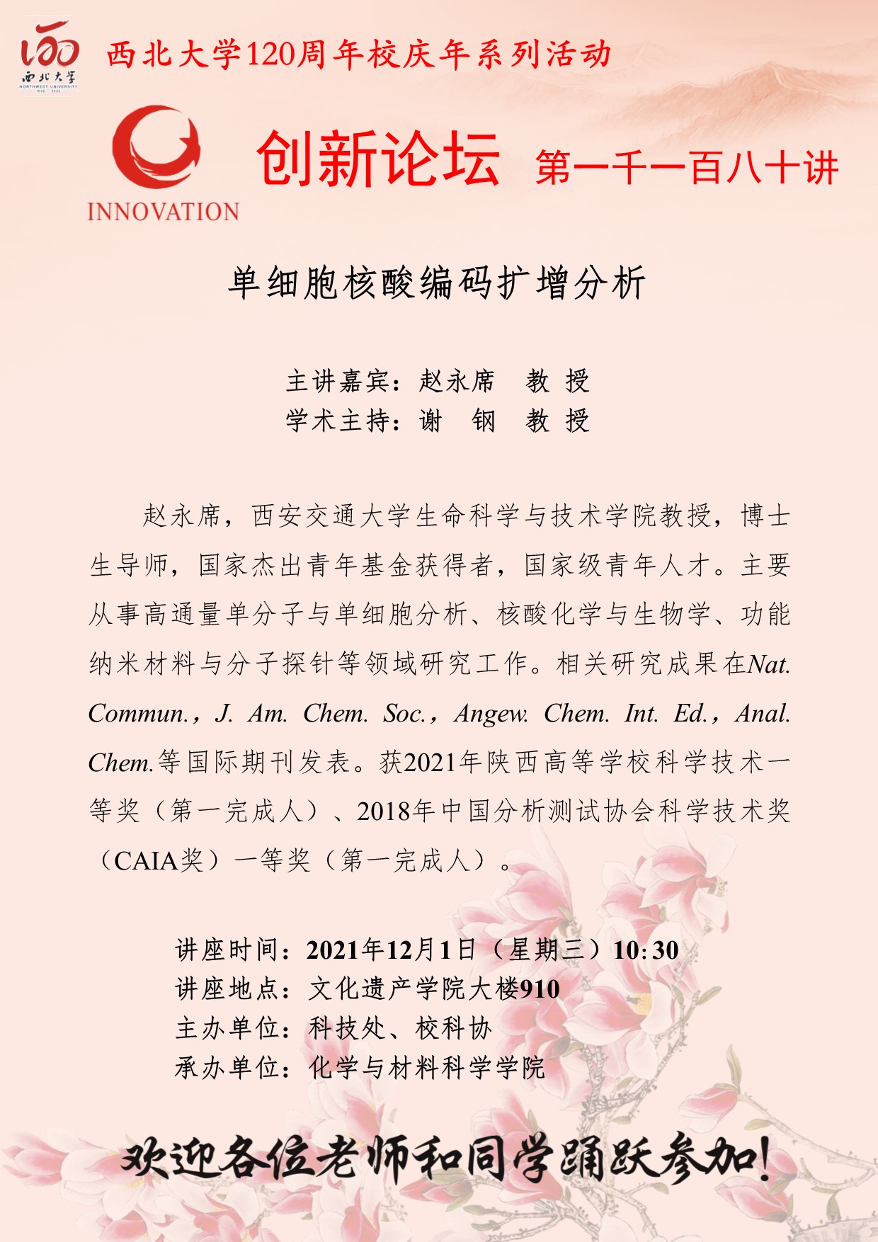 赵永席 教授 星空app官网创新论坛第一千一百八十讲暨120周年校庆年系列活动:单细胞核酸编码扩增分析 讲座时间 2021年12月1日(星期三)10:30 讲座地点 文化遗产学院大楼910 讲座人介绍 赵永席 教授 讲座内容