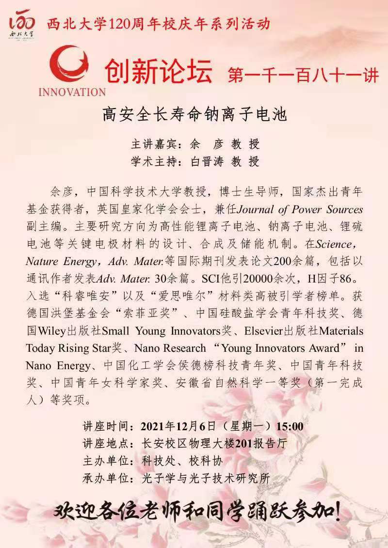 余彦 教授 星空app官网创新论坛第一千一百八十一讲暨120周年校庆年系列活动:高安全长寿命钠离子电池 讲座时间 2021年12月6日(星期一)15:00 讲座地点 长安校区物理大楼201报告厅 讲座人介绍 余彦 教授 讲座内容