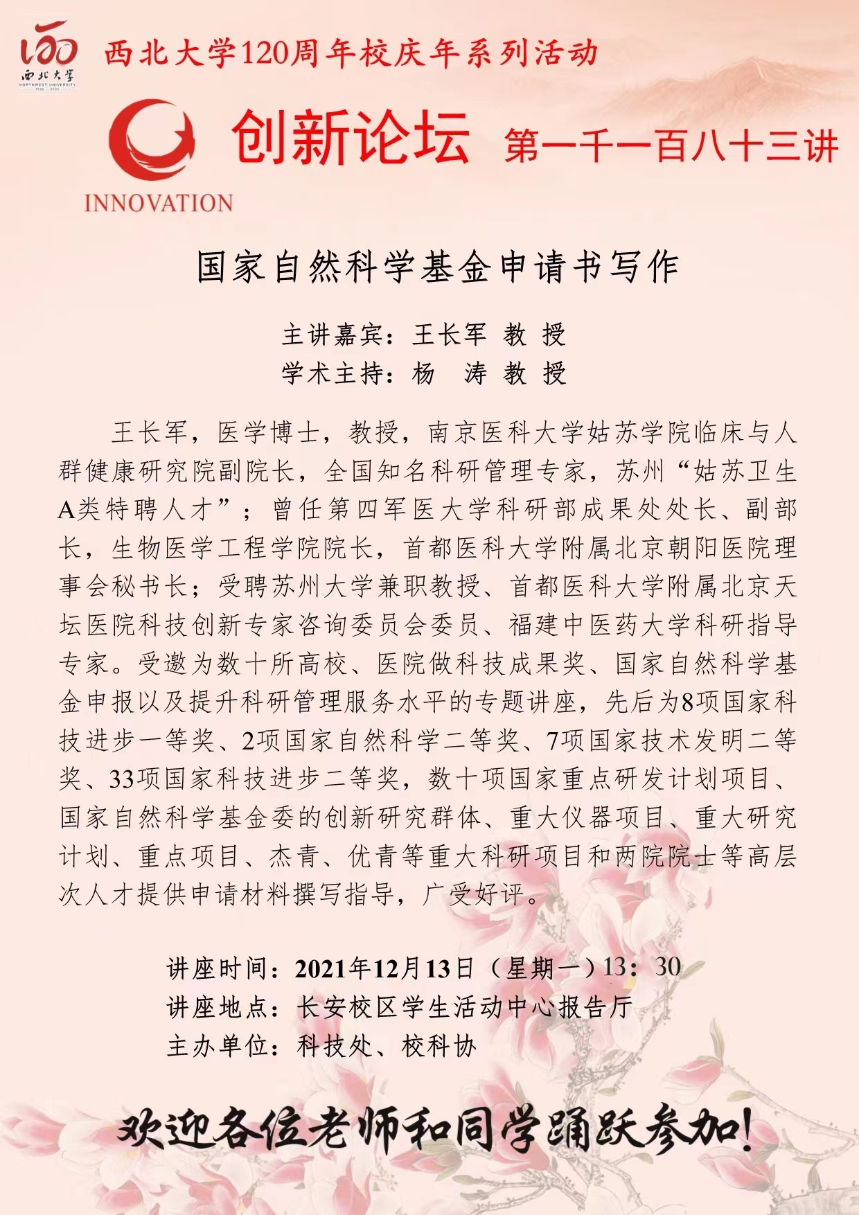 王长军 教授 星空app官网创新论坛第一千一百八十三讲暨120周年校庆年系列活动:国家自然科学基金申请书写作 讲座时间 2021年12月13日(星期一)13:30 讲座地点 长安校区学生活动中心报告厅 讲座人介绍 王长军 教授 讲座内容