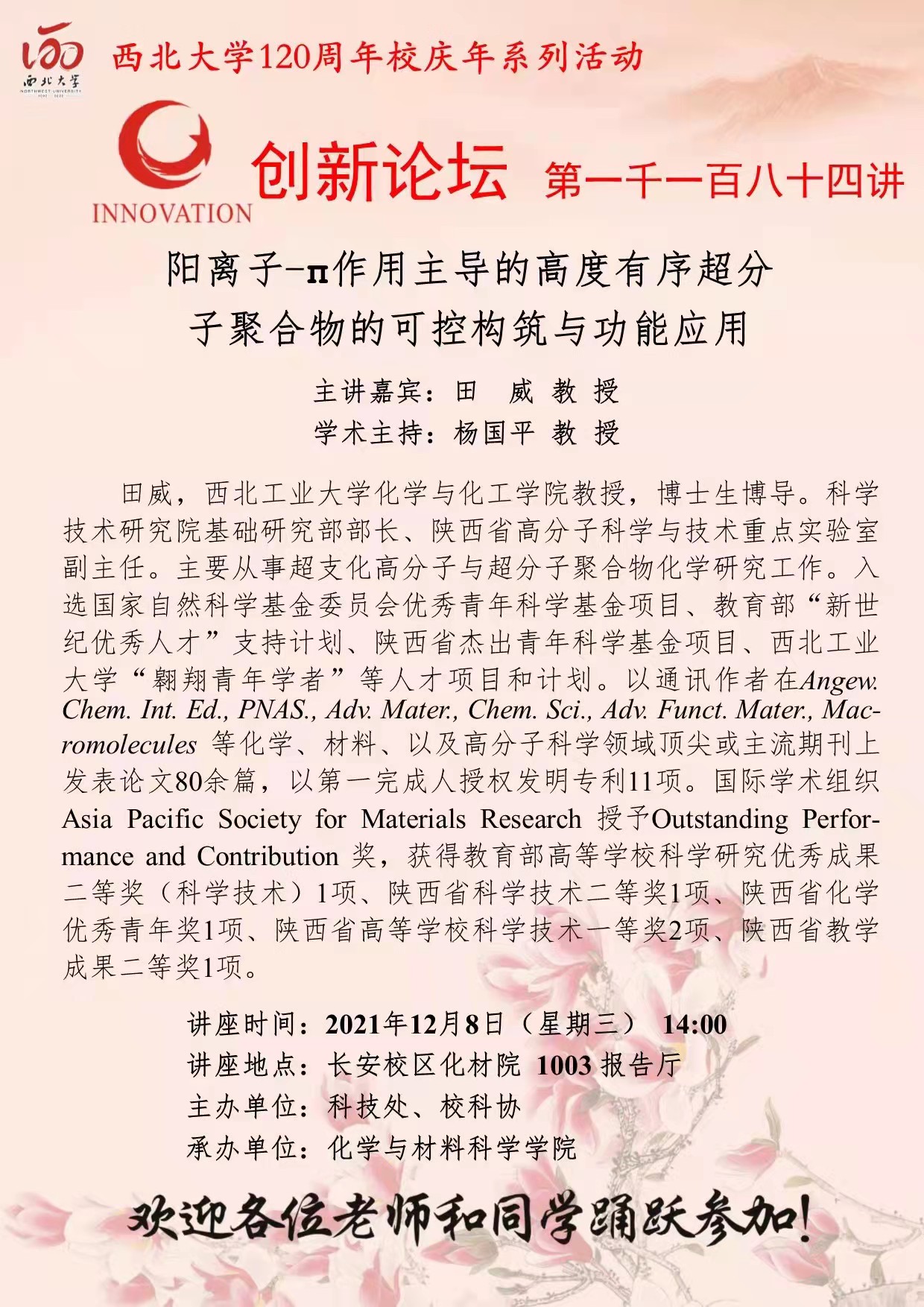 田威 教授 星空app官网创新论坛第一千一百八十四讲暨120周年校庆年系列活动:阳离子-π作用主导的高度有序超分子聚合物的可控构筑与功能应用 讲座时间 2021年12月8日(星期三) 14:00 讲座地点 长安校区化材院 1003 报告厅 讲座人介绍 田威 教授 讲座内容