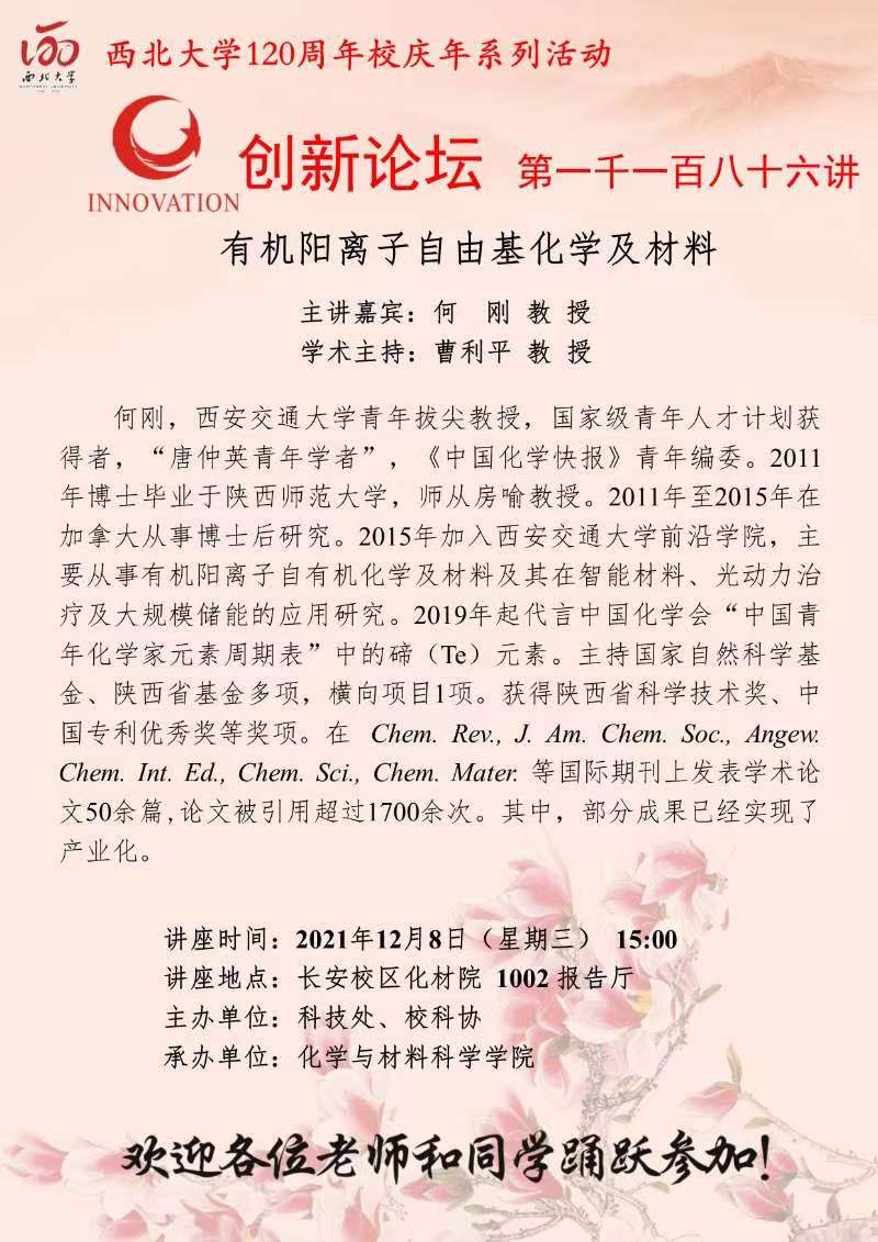 何刚 教授 星空app官网创新论坛第一千一百八十六讲暨120周年校庆年系列活动:有机阳离子自由基化学及材料 讲座时间 2021年12月8日(星期三) 15:00 讲座地点 长安校区化材院1002报告厅 讲座人介绍 何刚 教授 讲座内容
