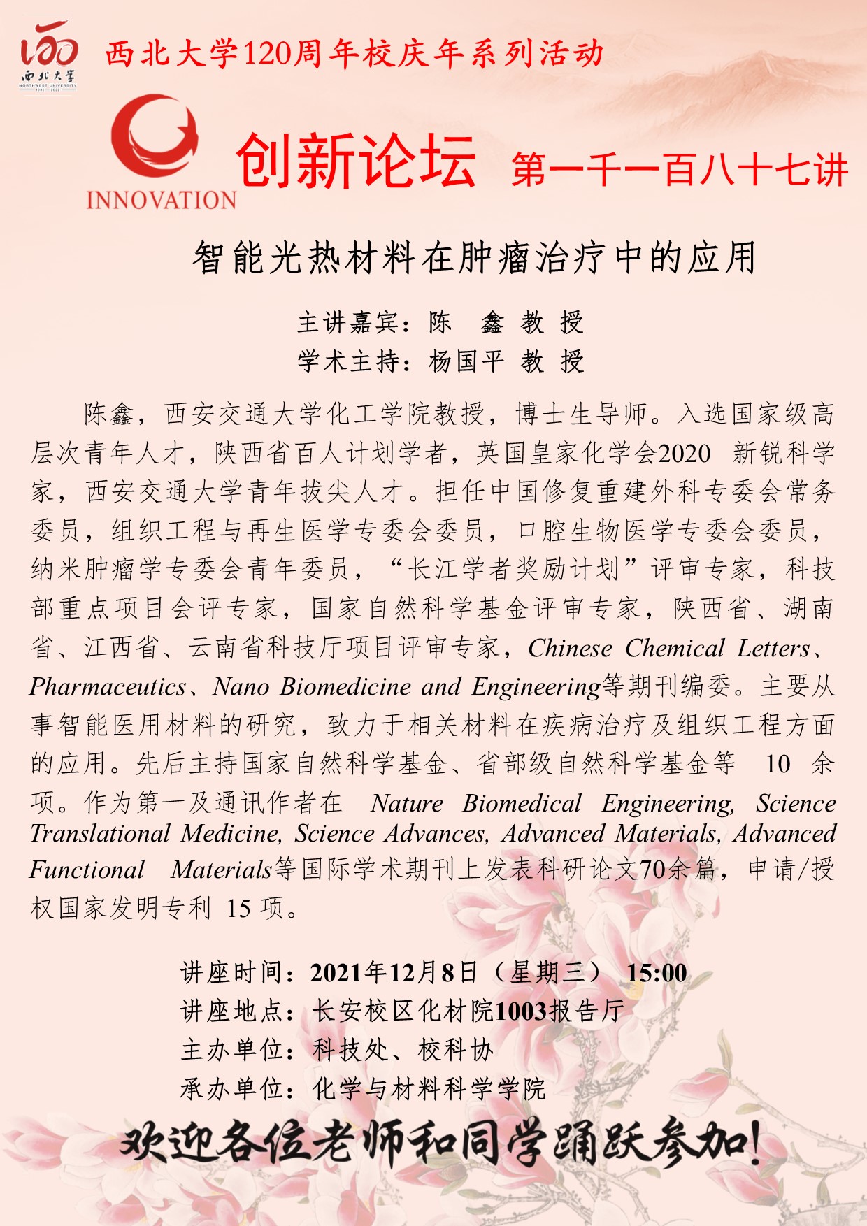 陈鑫 教授 星空app官网创新论坛第一千一百八十七讲暨120周年校庆年系列活动:智能光热材料在肿瘤治疗中的应用 讲座时间 2021年12月8日(星期三) 15:00 讲座地点 长安校区化材院1003报告厅 讲座人介绍 陈鑫 教授 讲座内容