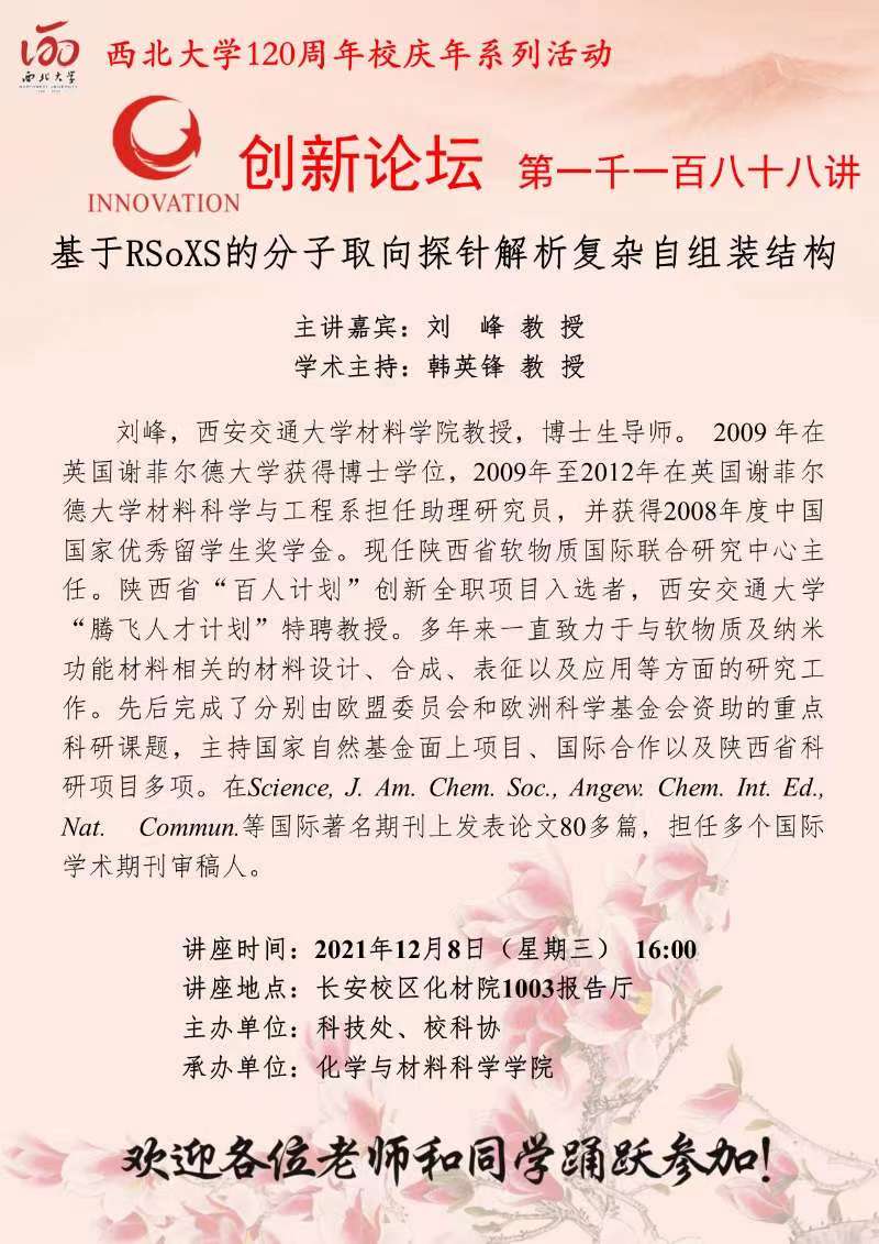 刘峰 教授 星空app官网创新论坛第一千一百八十八讲暨120周年校庆年系列活动:基于RSoXS的分子取向探针解析复杂自组装结构 讲座时间 2021年12月8日(星期三) 16:00 讲座地点 长安校区化材院1003报告厅 讲座人介绍 刘峰 教授 讲座内容