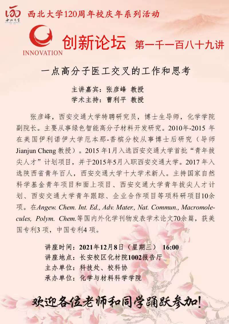 张彦峰 教授 星空app官网创新论坛第一千一百八十九讲暨120周年校庆年系列活动:一点高分子医工交叉的工作和思考 讲座时间 2021年12月8日(星期三) 16:00 讲座地点 长安校区化材院1002报告厅 讲座人介绍 张彦峰 教授 讲座内容