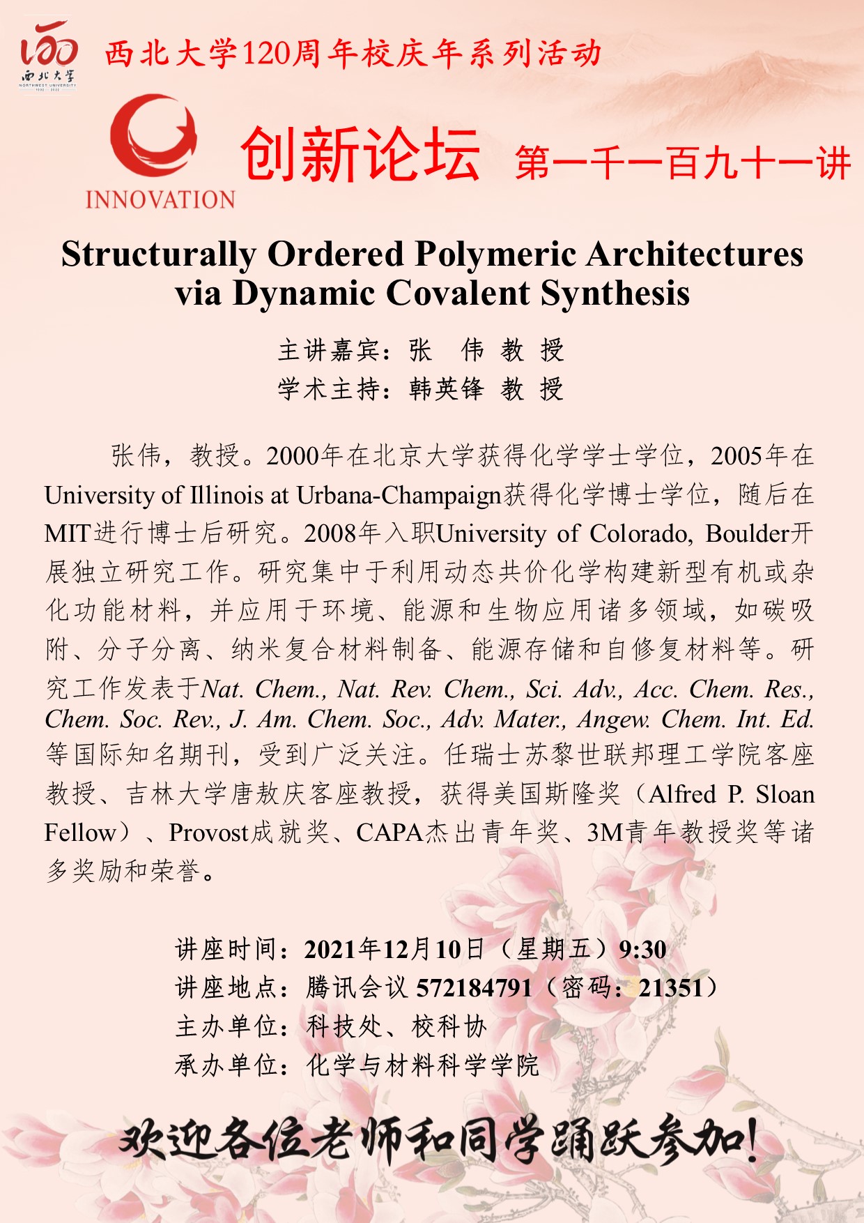 张伟 教授 星空app官网创新论坛第一千一百九十一讲暨120周年校庆年系列活动:Structurally Ordered Polymeric Architectures via Dynamic Covalent Synthesis 讲座时间 2021年12月10日(星期五)9:30 讲座地点 腾讯会议 572184791(密码:21351) 讲座人介绍 张伟 教授 讲座内容