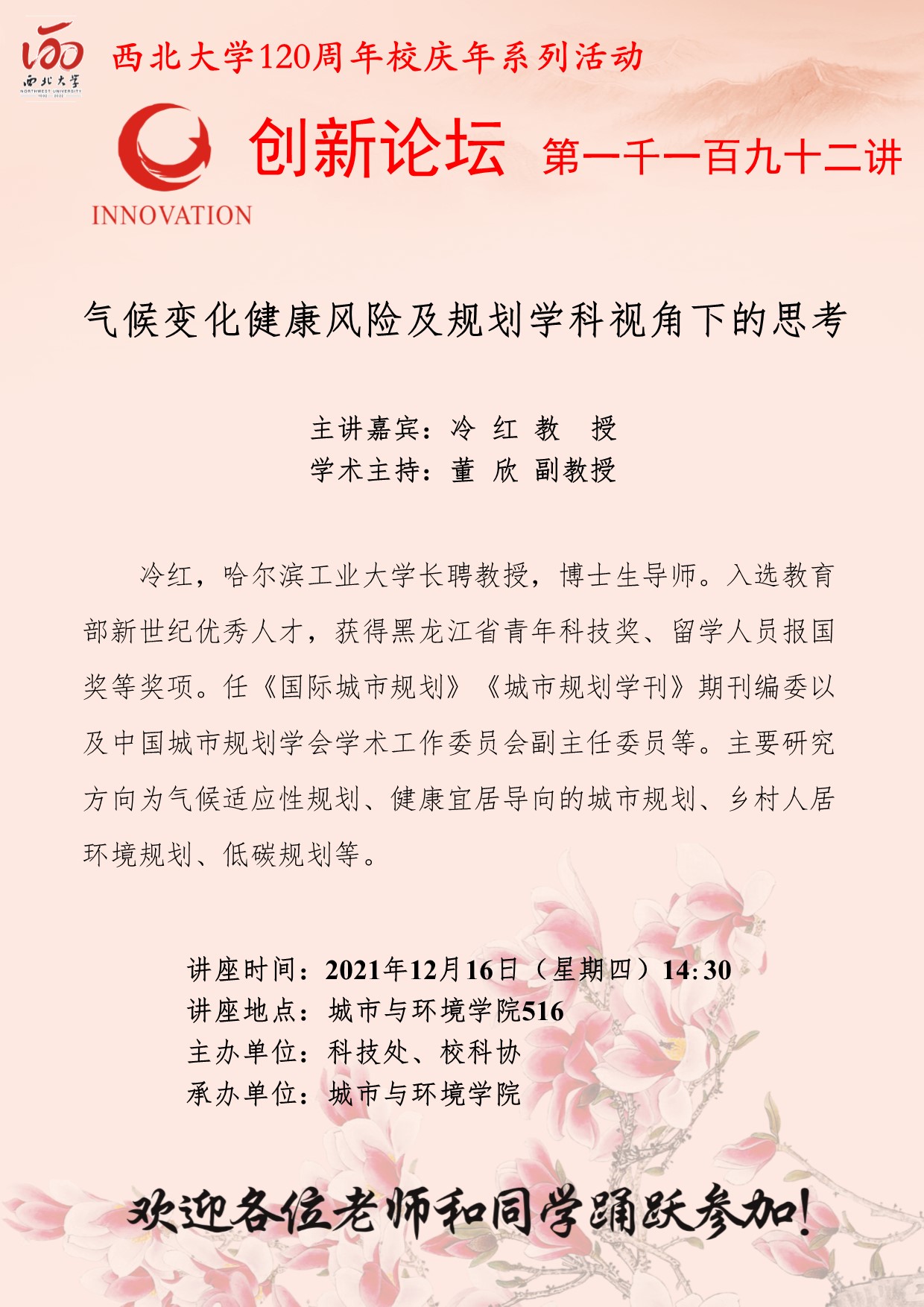 冷红 教授 星空app官网创新论坛第一千一百九十二讲暨120周年校庆年系列活动:气候变化健康风险及规划学科视角下的思考 讲座时间 2021年12月16日(星期四)14:30 讲座地点 城市与环境学院516 讲座人介绍 冷红 教授 讲座内容