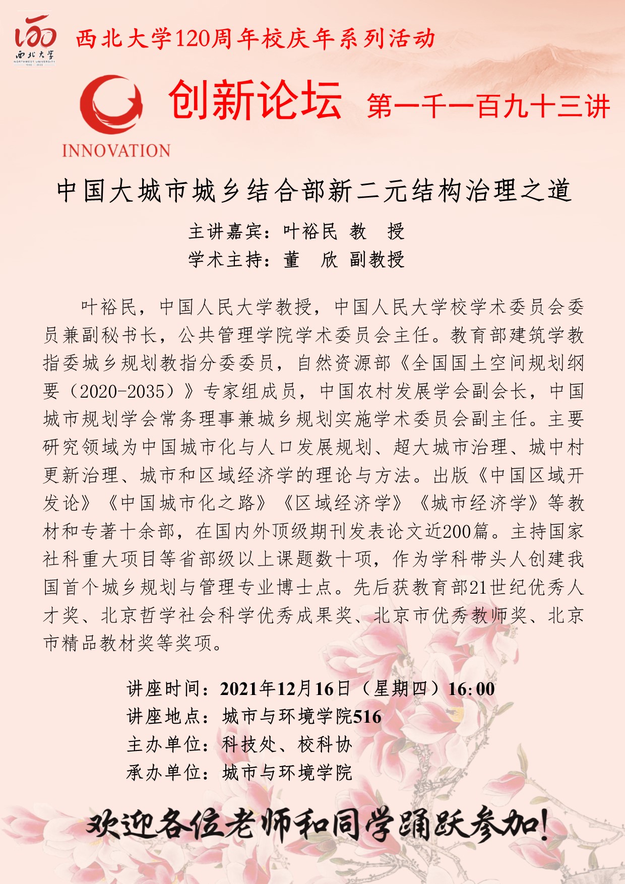 叶裕民 教授 星空app官网创新论坛第一千一百九十三讲暨120周年校庆年系列活动:中国大城市城乡结合部新二元结构治理之道 讲座时间 2021年12月16日(星期四)16:00 讲座地点 城市与环境学院516 讲座人介绍 叶裕民 教授 讲座内容