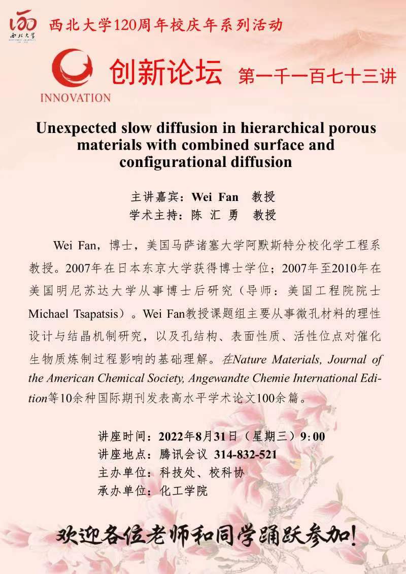 Wei Fan 教授 星空app官网创新论坛第一千二百七十三讲暨120周年校庆年系列活动: Unexpected slow diffusion in hierarchical porous materials with combined surface and configurational diffusion 讲座时间 2022年8月31日(星期三)9:00 讲座地点 腾讯会议 314-832-521 讲座人介绍 Wei Fan 教授 讲座内容