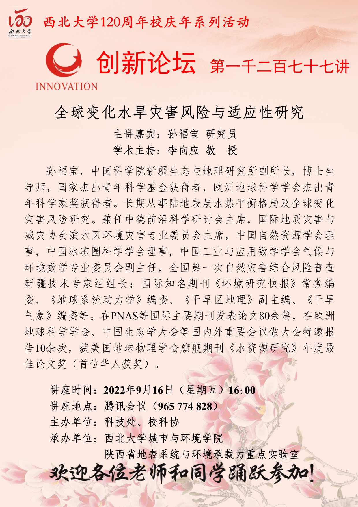 孙福宝 研究员 星空app官网创新论坛第一千二百七十七讲暨120周年校庆年系列活动:全球变化水旱灾害风险与适应性研究 讲座时间 2022年9月16日(星期五)16:00 讲座地点 腾讯会议(965 774 828) 讲座人介绍 孙福宝 研究员 讲座内容
