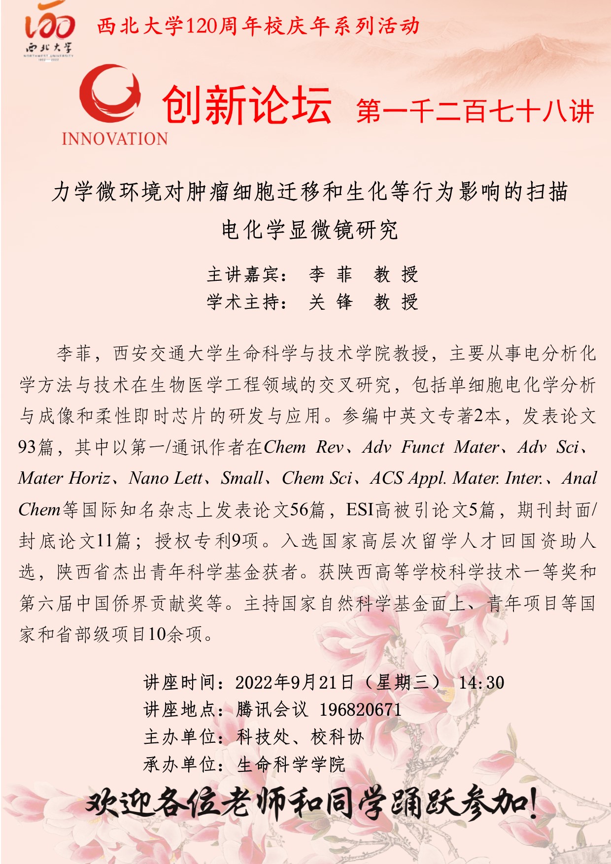 李 菲 教 授 星空app官网创新论坛第一千二百七十八讲暨120周年校庆年系列活动:力学微环境对肿瘤细胞迁移和生化等行为影响的扫描电化学显微镜研究 讲座时间 2022年9月21日(星期三) 14:30 讲座地点 腾讯会议 196820671 讲座人介绍 李 菲 教 授 讲座内容