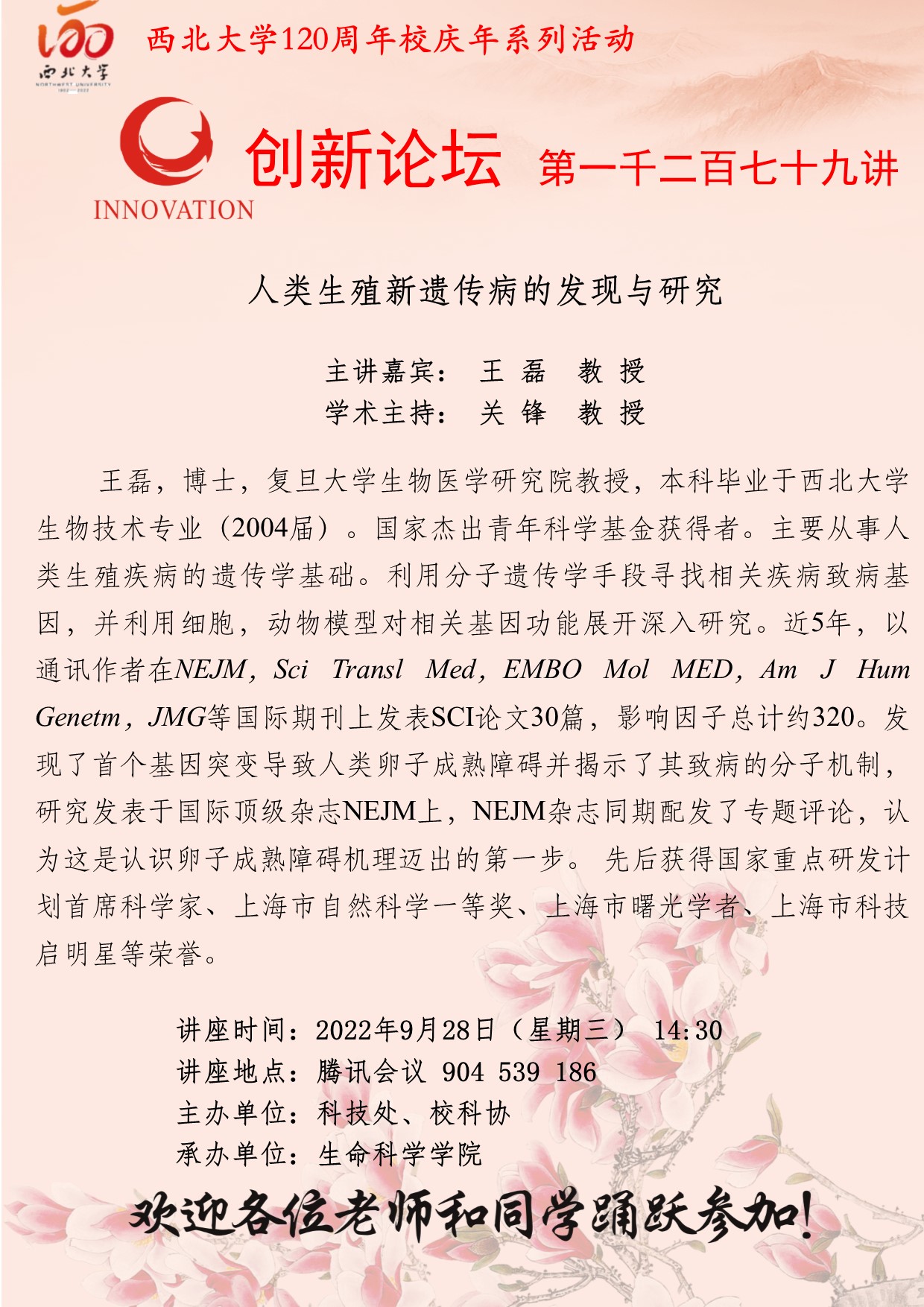 王 磊 教 授 星空app官网创新论坛第一千二百七十九讲暨120周年校庆年系列活动:人类生殖新遗传病的发现与研究 讲座时间 2022年9月28日(星期三) 14:30 讲座地点 腾讯会议 904 539 186 讲座人介绍 王 磊 教 授 讲座内容