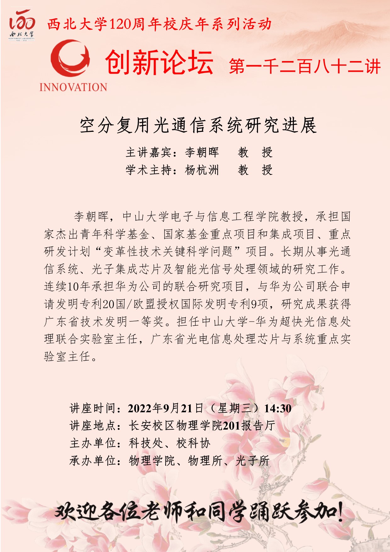 李朝晖 教授 星空app官网创新论坛第一千二百八十二讲暨120周年校庆年系列活动::空分复用光通信系统研究进展 讲座时间 2022年9月21日(星期三) 14:30 讲座地点 物理学院201报告厅 讲座人介绍 李朝晖 教授 讲座内容