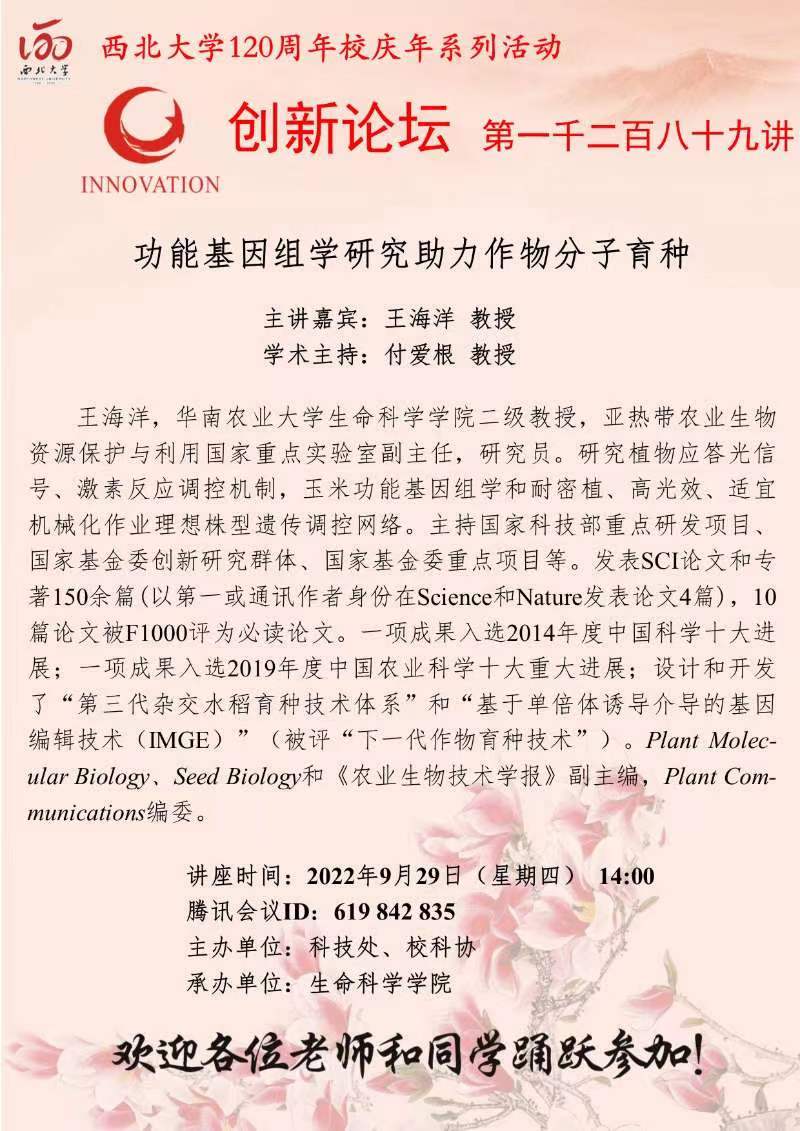 王海洋 教授 星空app官网创新论坛第一千二百八十九讲暨120周年校庆年系列活动: 功能基因组学研究助力作物分子育种 讲座时间 2022年9月29日(星期四) 14:00 讲座地点 腾讯会议 619 842 835 讲座人介绍 王海洋 教授 讲座内容
