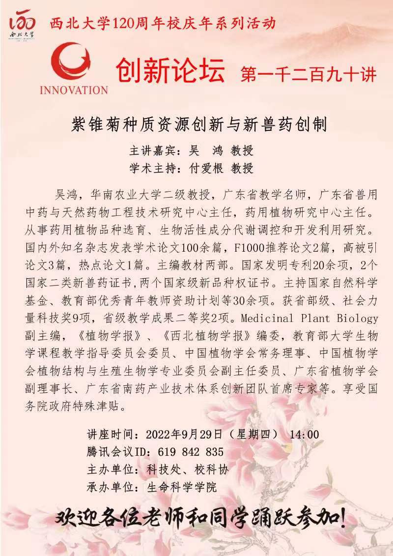 吴 鸿 教授 星空app官网创新论坛第一千二百九十讲暨120周年校庆年系列活动: 紫锥菊种质资源创新与新兽药创制 讲座时间 2022年9月29日(星期四) 14:00 讲座地点 腾讯会议 619 842 835 讲座人介绍 吴 鸿 教授 讲座内容