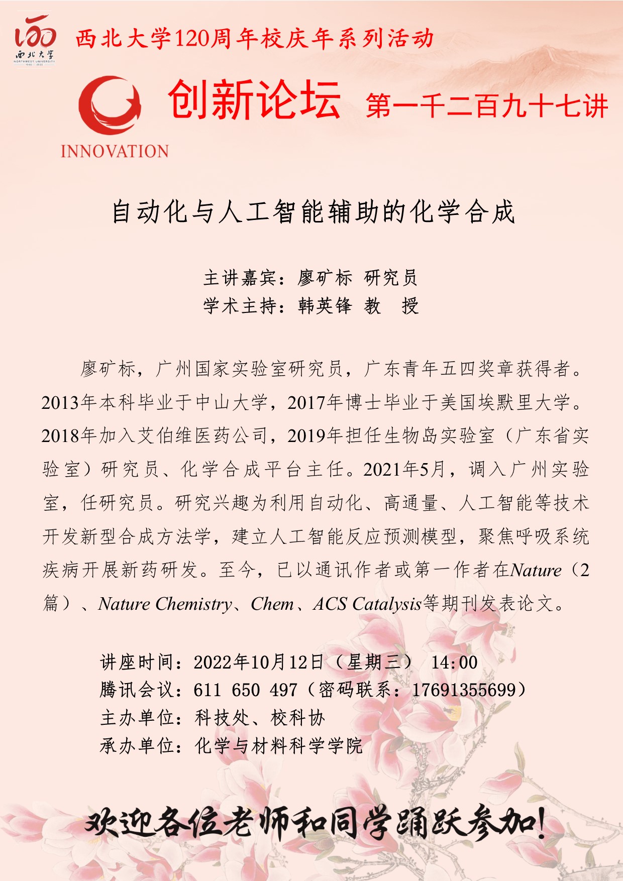 廖矿标 研究员 星空app官网创新论坛第一千二百九十七讲暨120周年校庆年系列活动: 自动化与人工智能辅助的化学合成 讲座时间 2022年10月12日(星期三) 14:00 讲座地点 腾讯会议 611 650 497 讲座人介绍 廖矿标 研究员 讲座内容