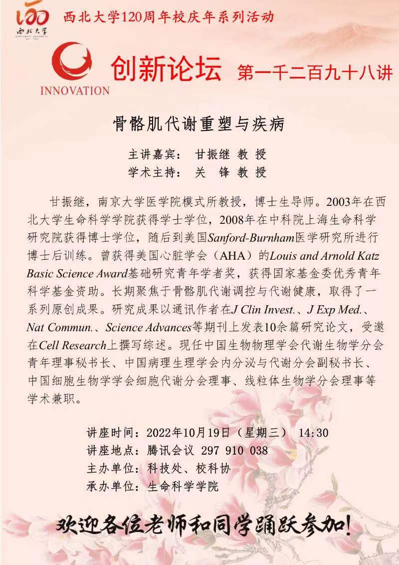 甘振继 教授 星空app官网创新论坛第一千二百九十八讲暨120周年校庆年系列活动: 骨骼肌代谢重塑与疾病 讲座时间 2022年10月19日(星期三) 14:30 讲座地点 腾讯会议 297 910 038 讲座人介绍 甘振继 教授 讲座内容