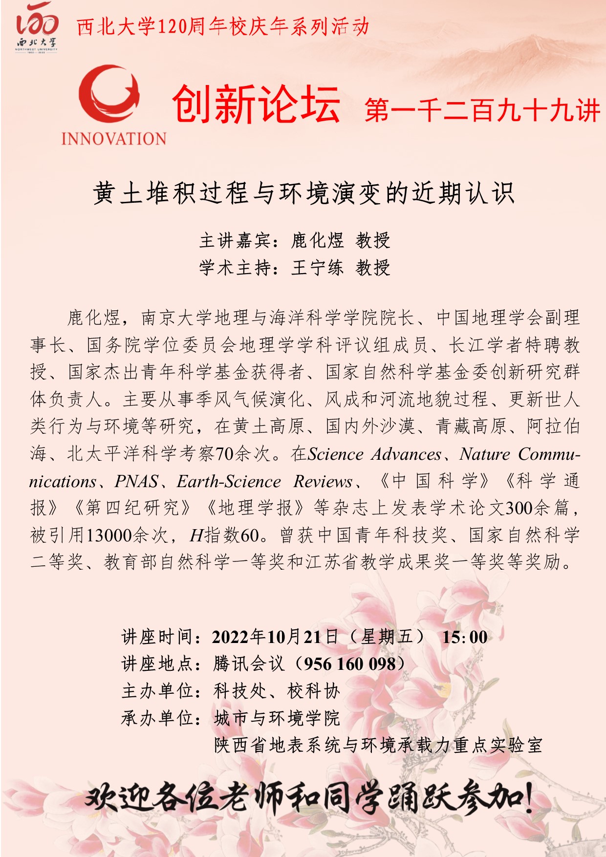 鹿化煜 教授 星空app官网创新论坛第一千二百九十九讲暨120周年校庆年系列活动:黄土堆积过程与环境演变的近期认识 讲座时间 2022年10月21日(星期五) 15:00 讲座地点 腾讯会议(956 160 098) 讲座人介绍 鹿化煜 教授 讲座内容
