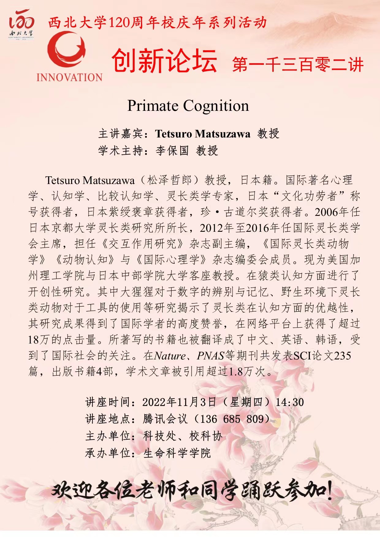 Tetsuro Matsuzawa 教授 星空app官网创新论坛第一千三百零二讲暨120周年校庆年系列活动: Primate Cognition 讲座时间 2022年11月3日(星期四)14:30 讲座地点 腾讯会议 136 685 809 讲座人介绍 Tetsuro Matsuzawa 教授 讲座内容