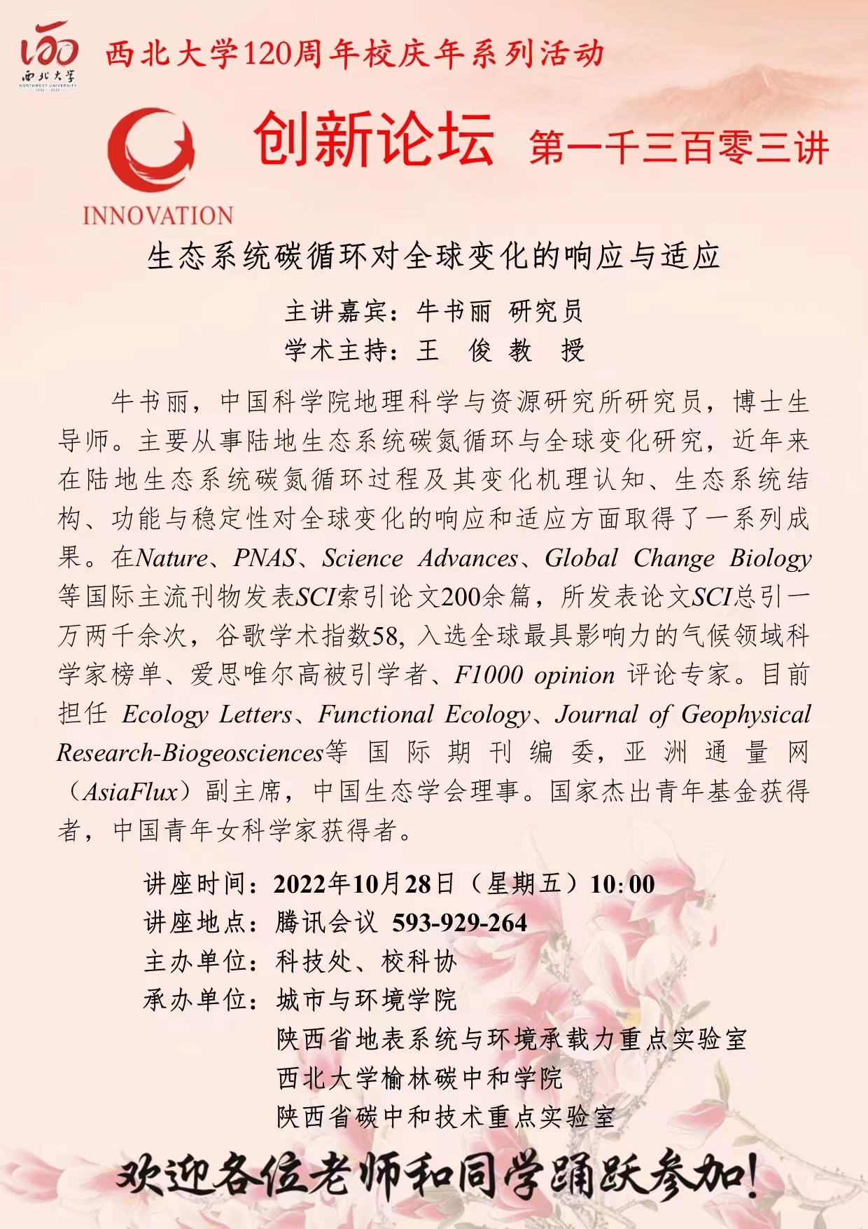 牛书丽 研究员 星空app官网创新论坛第一千三百零三讲暨120周年校庆年系列活动: 生态系统碳循环对全球变化的响应与适应 讲座时间 2022年10月28日(星期五) 10:00 讲座地点 腾讯会议 593-929-264 讲座人介绍 牛书丽 研究员 讲座内容