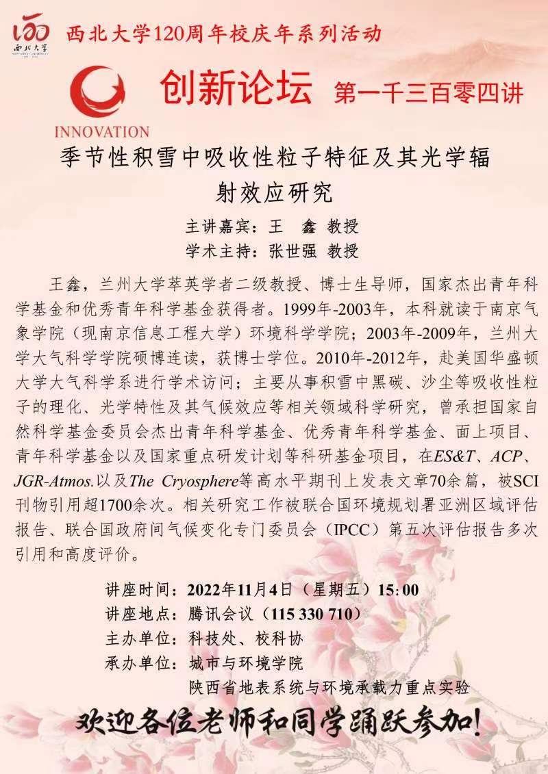 王 鑫 教授 星空app官网创新论坛第一千三百零四讲暨120周年校庆年系列活动: 季节性积雪中吸收性粒子特征及其光学辐射效应研究 讲座时间 2022年11月4日(星期五)15:00 讲座地点 腾讯会议 115 330 710 讲座人介绍 王 鑫 教授 讲座内容