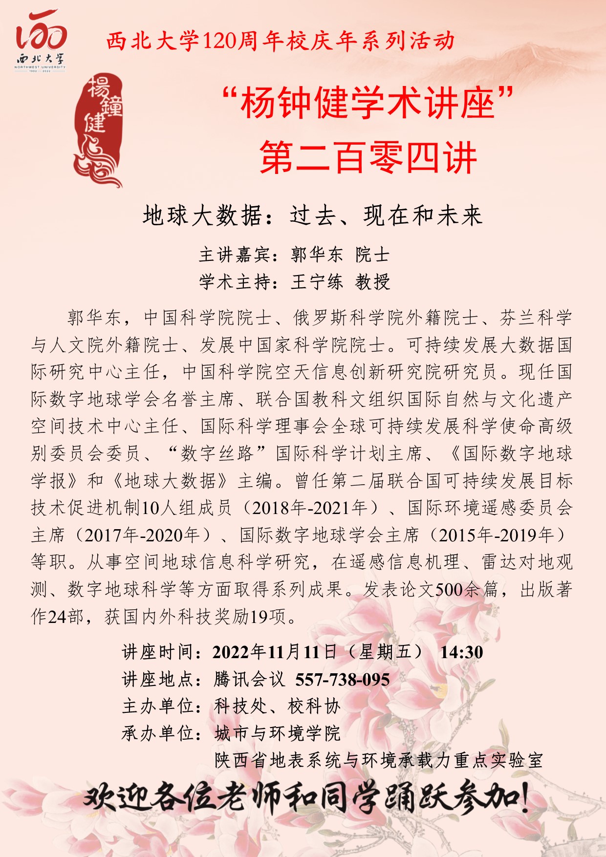 “杨钟健学术讲座”第二百零四讲暨120周年校庆年系列活动:地球大数据:过去、现在和未来