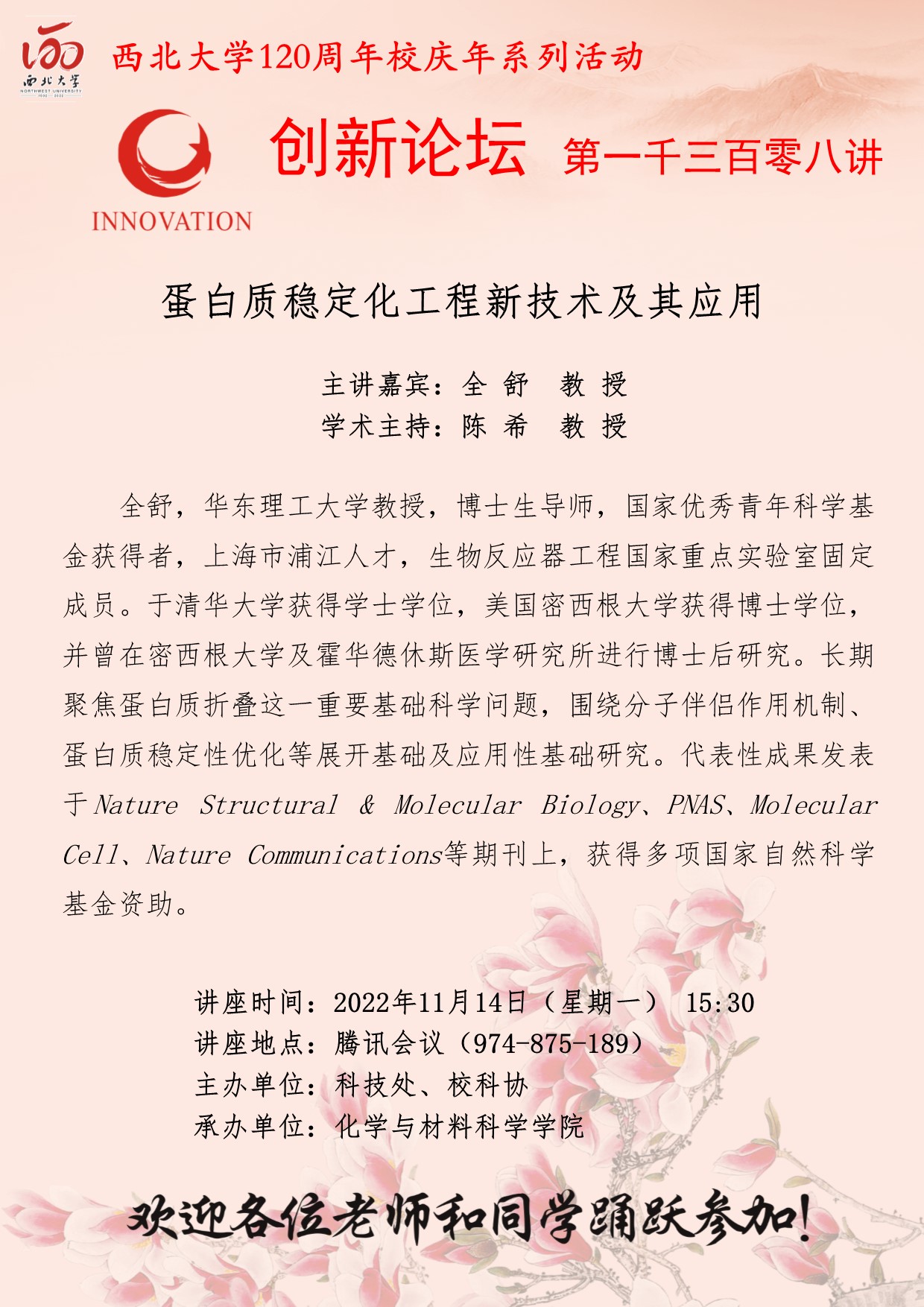 全舒 教授 星空app官网创新论坛第一千三百零八讲暨120周年校庆年系列活动: 蛋白质稳定化工程新技术及其应用 讲座时间 2022年11月14日(星期一)15:30 讲座地点 腾讯会议(974 875 189) 讲座人介绍 全舒 教授 讲座内容