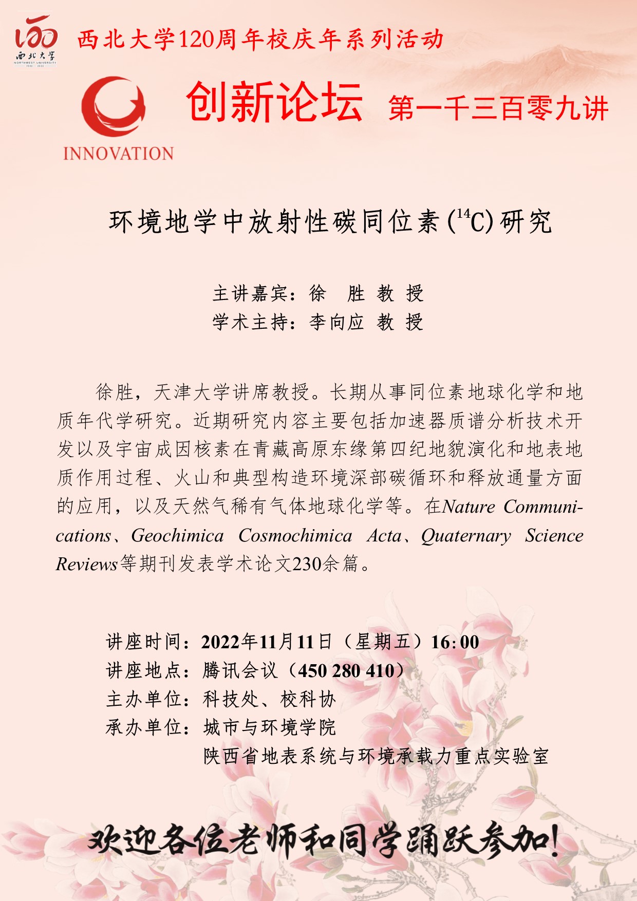 徐胜 教授 星空app官网创新论坛第一千三百零九讲暨120周年校庆年系列活动: 环境地学中放射性碳同位素(14C)研究 讲座时间 2022年11月11日(星期五)16:00 讲座地点 腾讯会议(450 280 410) 讲座人介绍 徐胜 教授 讲座内容