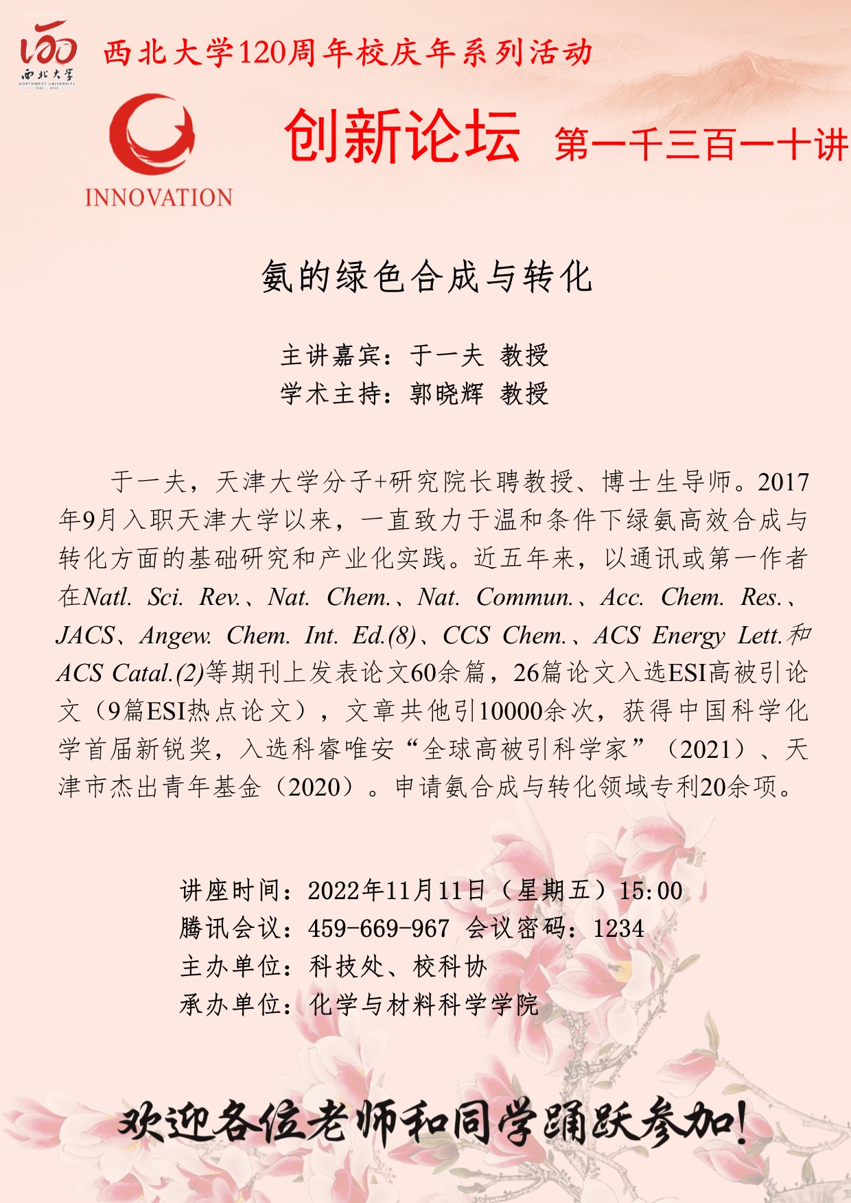 于一夫 教授 星空app官网创新论坛第一千三百一十讲暨120周年校庆年系列活动: 氨的绿色合成与转化 讲座时间 2022年11月11日(星期五)15:00 讲座地点 腾讯会议(459-669-967) 密码 1234 讲座人介绍 于一夫 教授 讲座内容