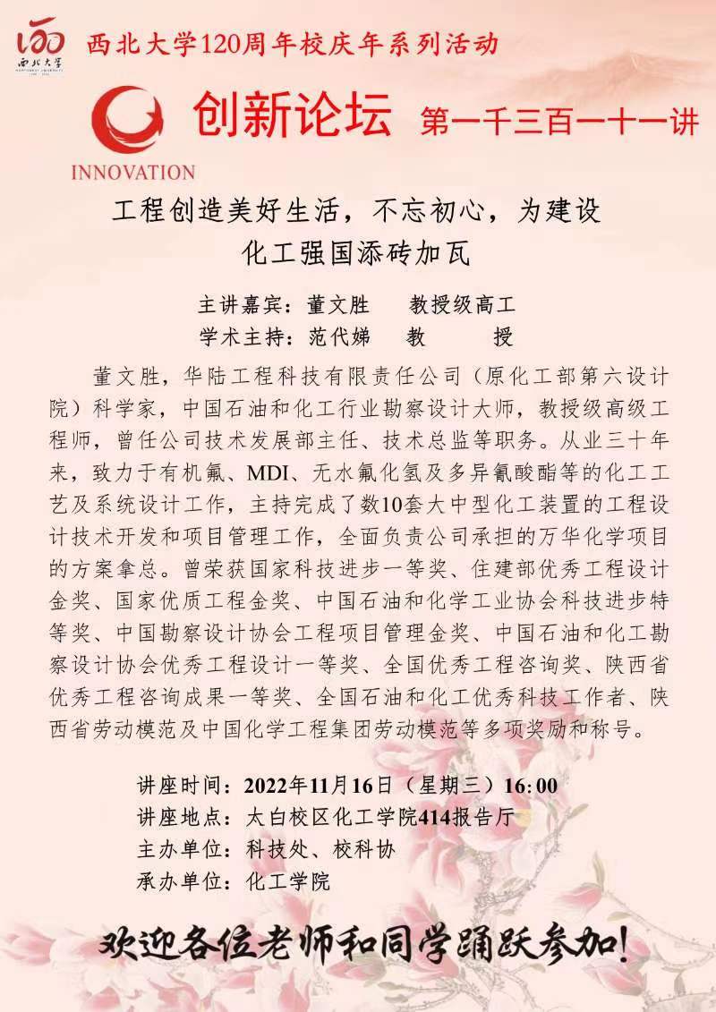 董文胜 教授级高工 星空app官网创新论坛第一千三百一十一讲暨120周年校庆年系列活动: 工程创造美好生活,不忘初心,为建设化工强国添砖加瓦 讲座时间 2022年11月16日(星期三)16:00 讲座地点 太白校区化工学院414报告厅 讲座人介绍 董文胜 教授级高工 讲座内容
