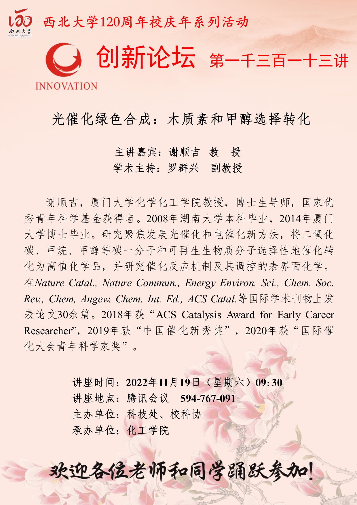 谢顺吉 教授 星空app官网创新论坛第一千三百一十三讲暨120周年校庆年系列活动: 光催化绿色合成:木质素和甲醇选择转化 讲座时间 2022年11月19日(星期六)09:30 讲座地点 腾讯会议( 594-767-091) 讲座人介绍 谢顺吉 教授 讲座内容
