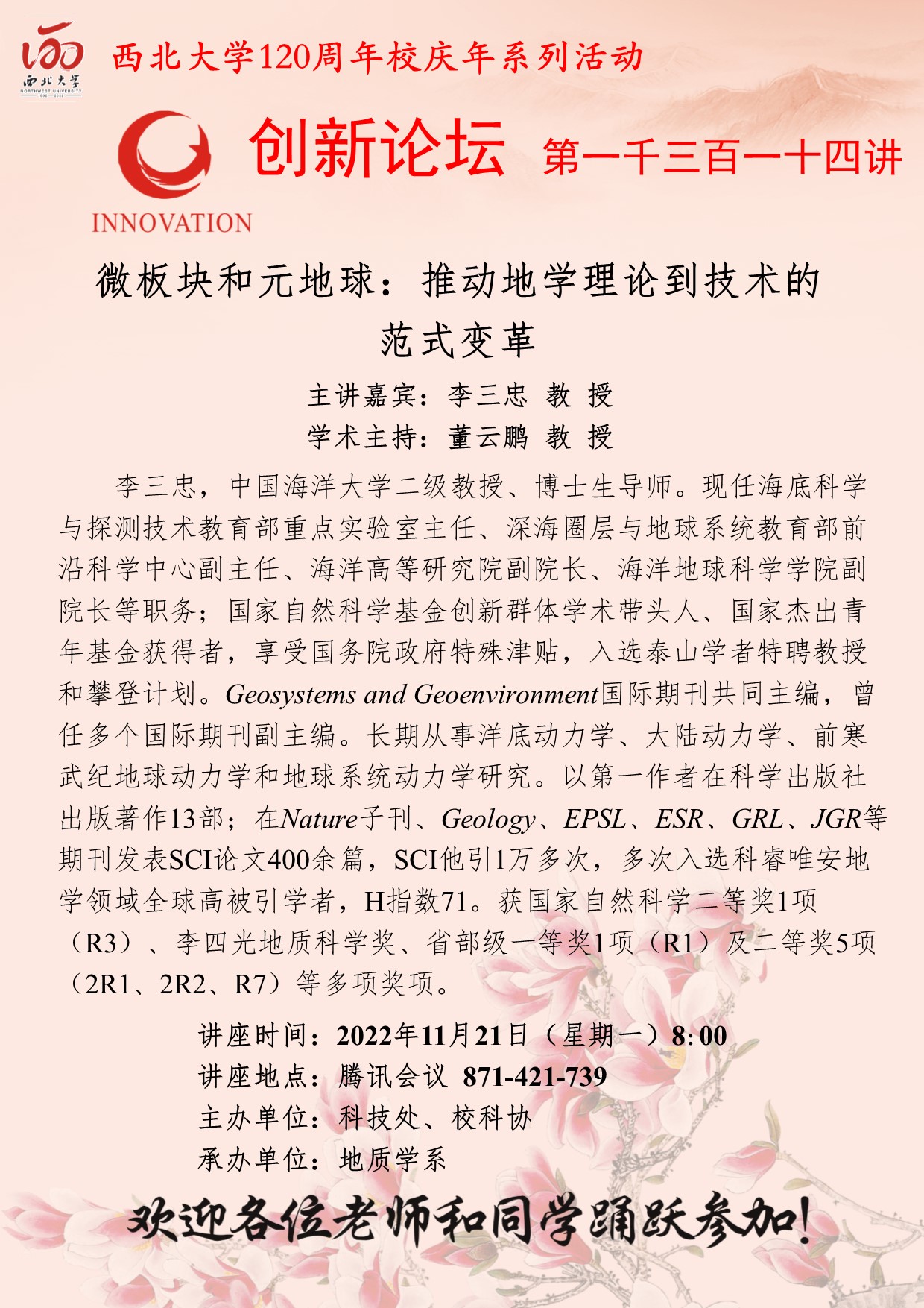 李三忠 教授 星空app官网创新论坛第一千三百一十四讲暨120周年校庆年系列活动: 微板块和元地球:推动地学理论到技术的范式变革 讲座时间 2022年11月21日(星期一)8:00 讲座地点 腾讯会议(871-421-739) 讲座人介绍 李三忠 教授 讲座内容