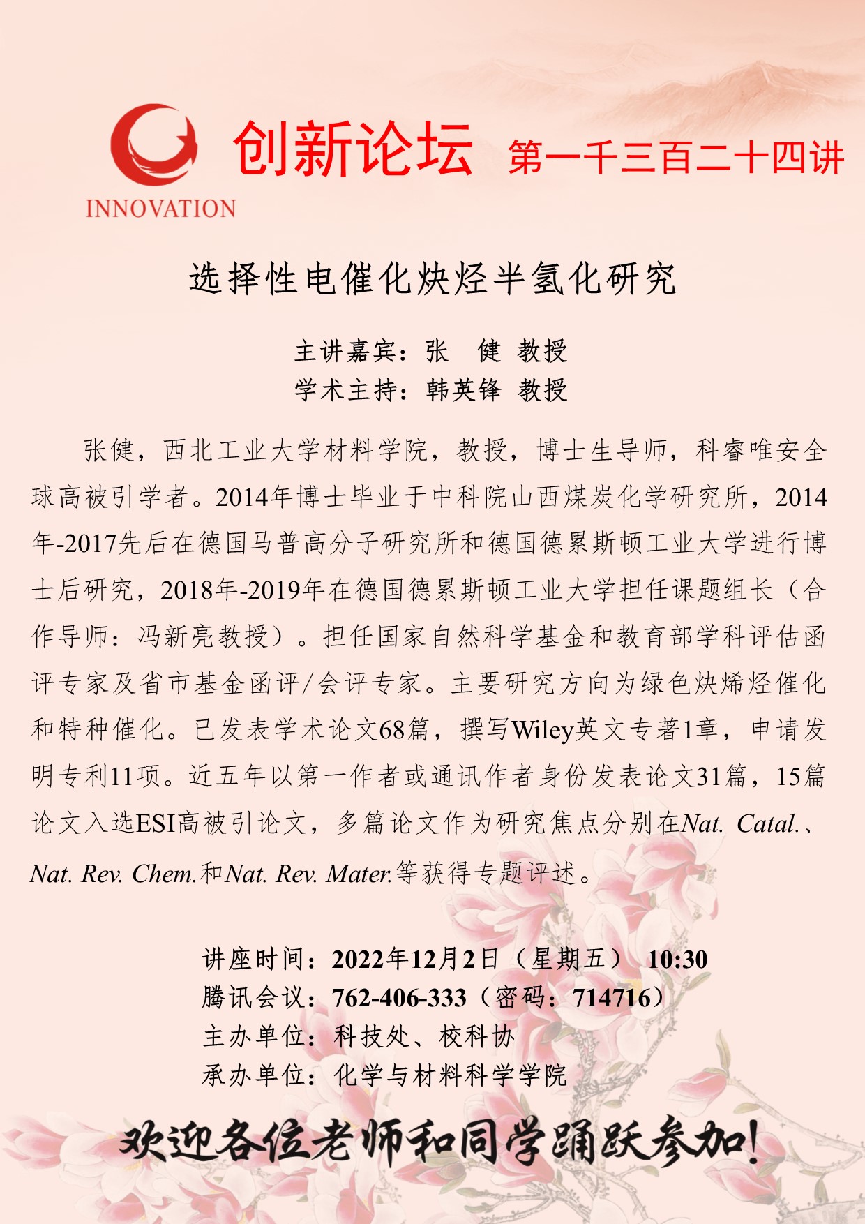张 健 教授 星空app官网创新论坛第一千三百二十四讲:选择性电催化炔烃半氢化研究 讲座时间 2022年12月2日(星期五) 10:30 讲座地点 腾讯会议762-406-333(密码:714716) 讲座人介绍 张 健 教授 讲座内容