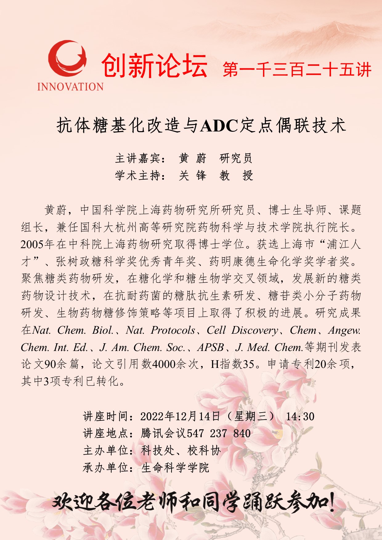 黄蔚 研究员 星空app官网创新论坛第一千三百二十五讲:抗体糖基化改造与ADC定点偶联技术 讲座时间 2022年12月14日(星期三) 14:30 讲座地点 腾讯会议547 237 840 讲座人介绍 黄蔚 研究员 讲座内容
