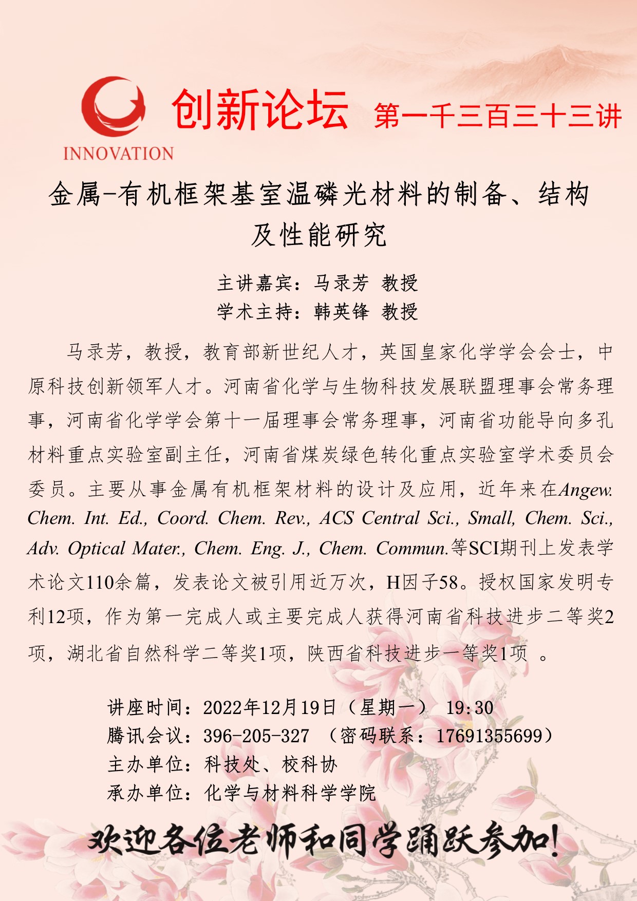 马录芳 教授 星空app官网创新论坛第一千三百三十三讲:金属-有机框架基室温磷光材料的制备、结构及性能研究 讲座时间 2022年12月19日(星期一) 19:30 讲座地点 腾讯会议:396-205-327 讲座人介绍 马录芳 教授 讲座内容