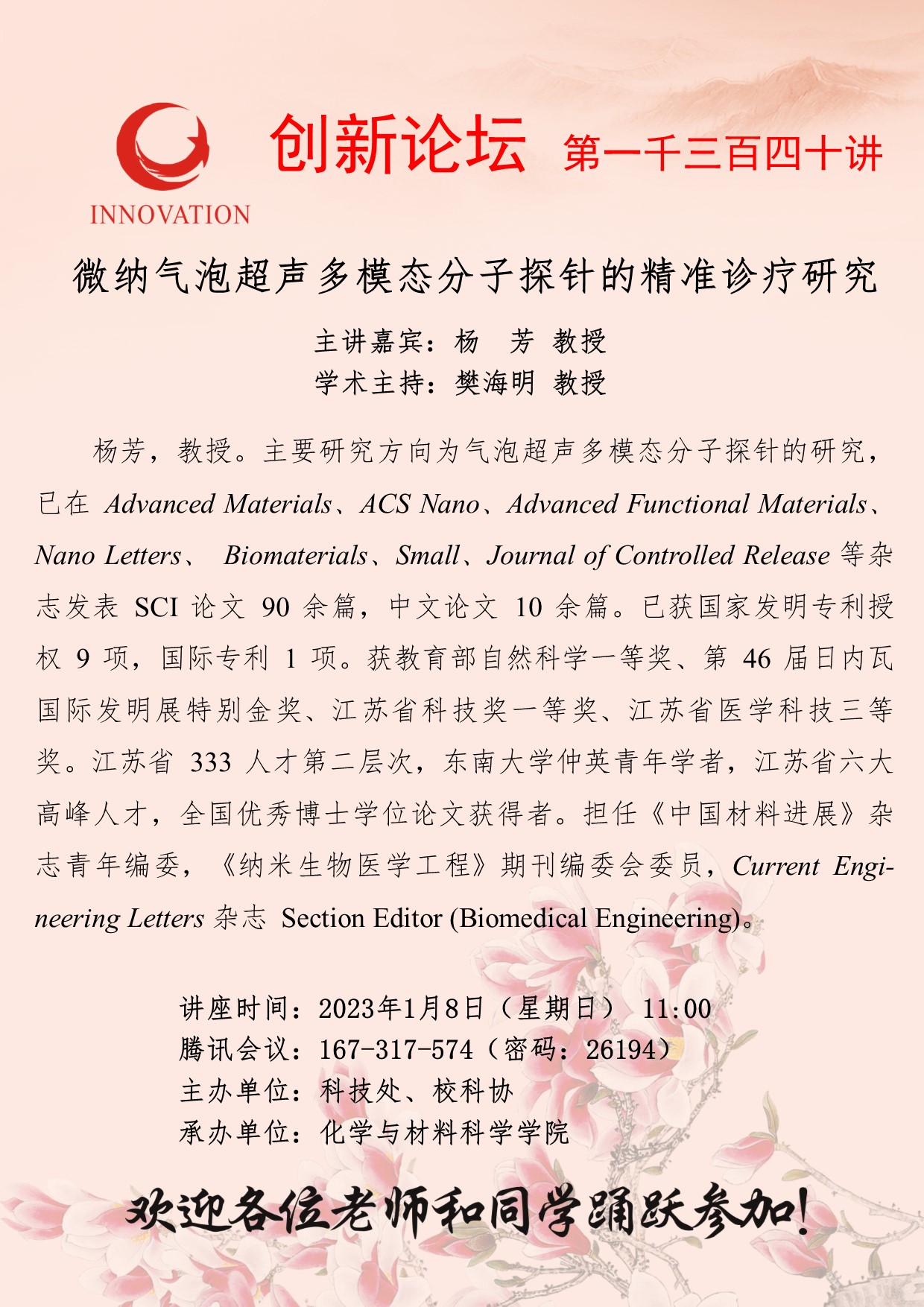 杨芳 教授 星空app官网创新论坛第一千三百四十讲:微纳气泡超声多模态分子探针的精准诊疗研究 讲座时间 2023年1月8日(星期日) 11:00 讲座地点 腾讯会议:167-317-574 讲座人介绍 杨芳 教授 讲座内容