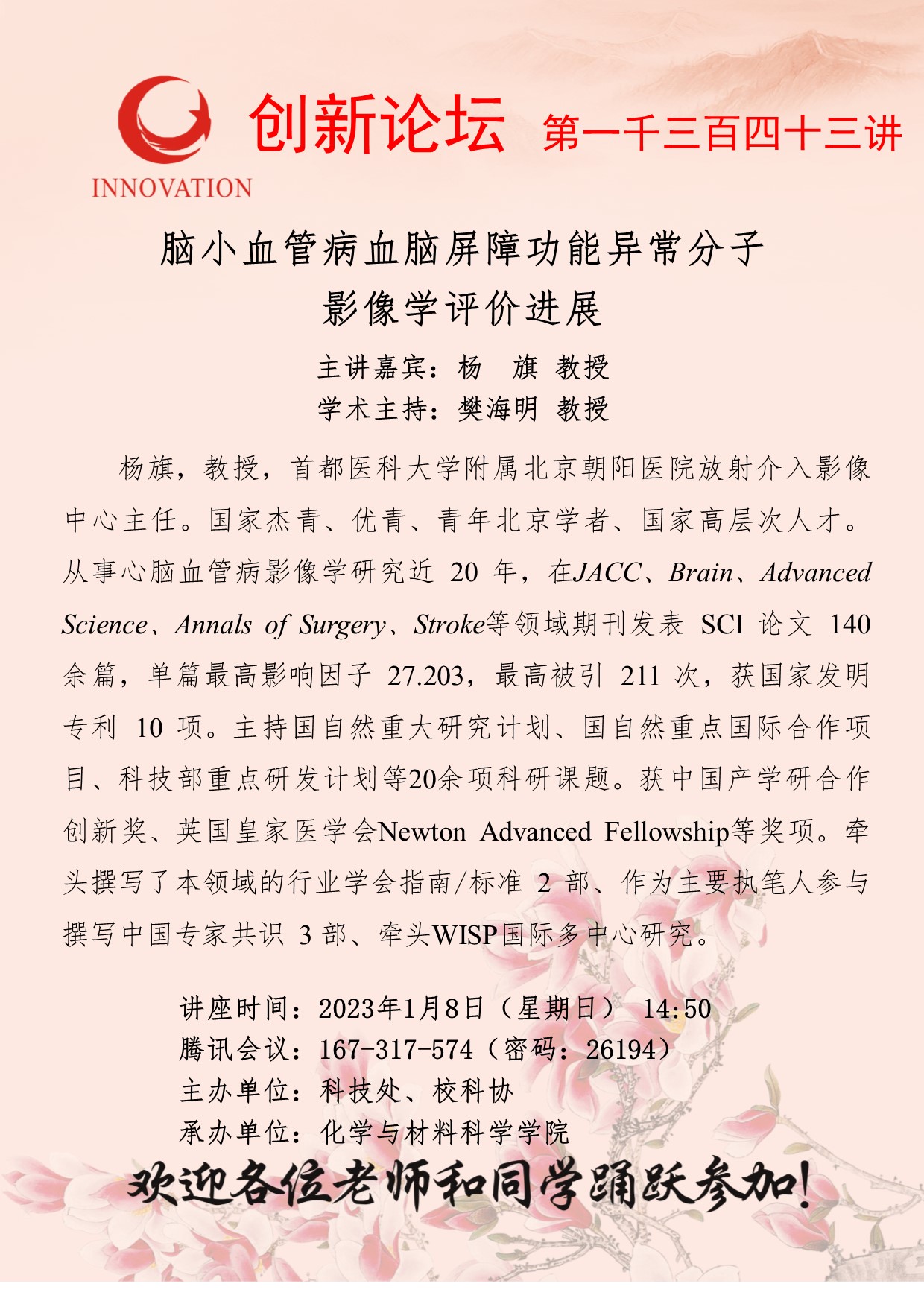 杨旗 教授 星空app官网创新论坛第一千三百四十三讲:脑小血管病血脑屏障功能异常分子影像学评价进展 讲座时间 2023年1月8日(星期日) 14:50 讲座地点 腾讯会议:167-317-574 讲座人介绍 杨旗 教授 讲座内容