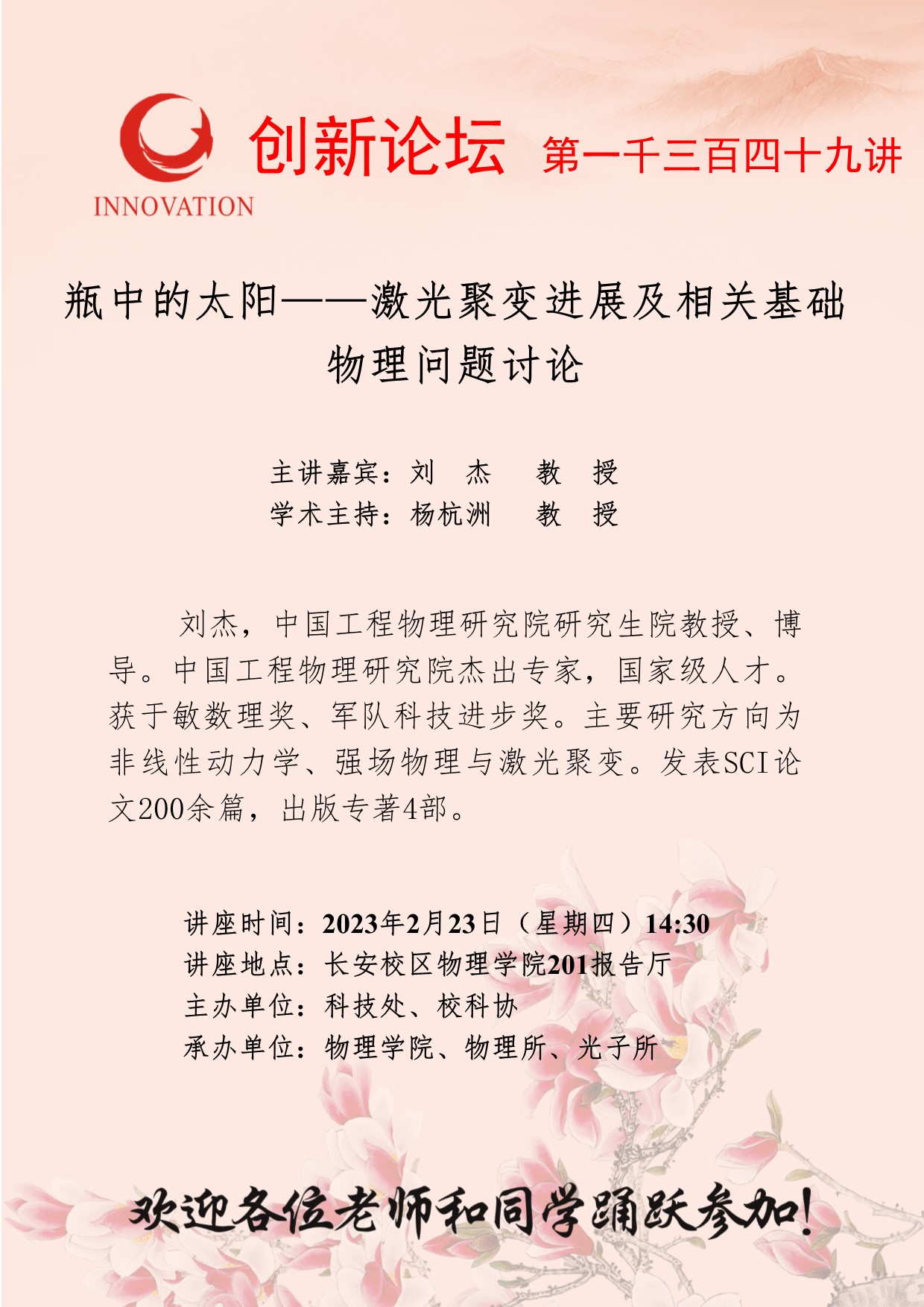 刘杰 教授 星空app官网创新论坛第一千三百四十九讲:瓶中的太阳——激光聚变进展及相关基础物理问题讨论 讲座时间 2023年2月23日(星期四)14:30 讲座地点 长安校区物理学院201报告厅 讲座人介绍 刘杰 教授 讲座内容