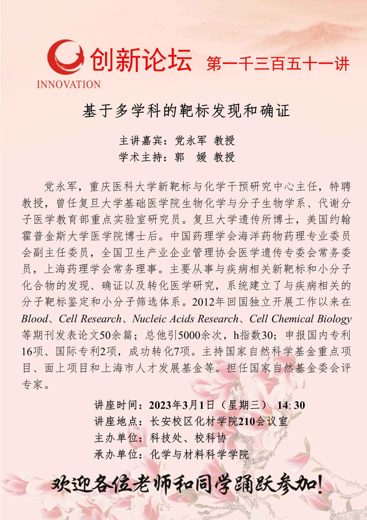 党永军 教授 星空app官网创新论坛第一千三百五十一讲:基于多学科的靶标发现和确证 讲座时间 2023年3月1日(星期三) 14: 30 讲座地点 长安校区化材学院210会议室 讲座人介绍 党永军 教授 讲座内容