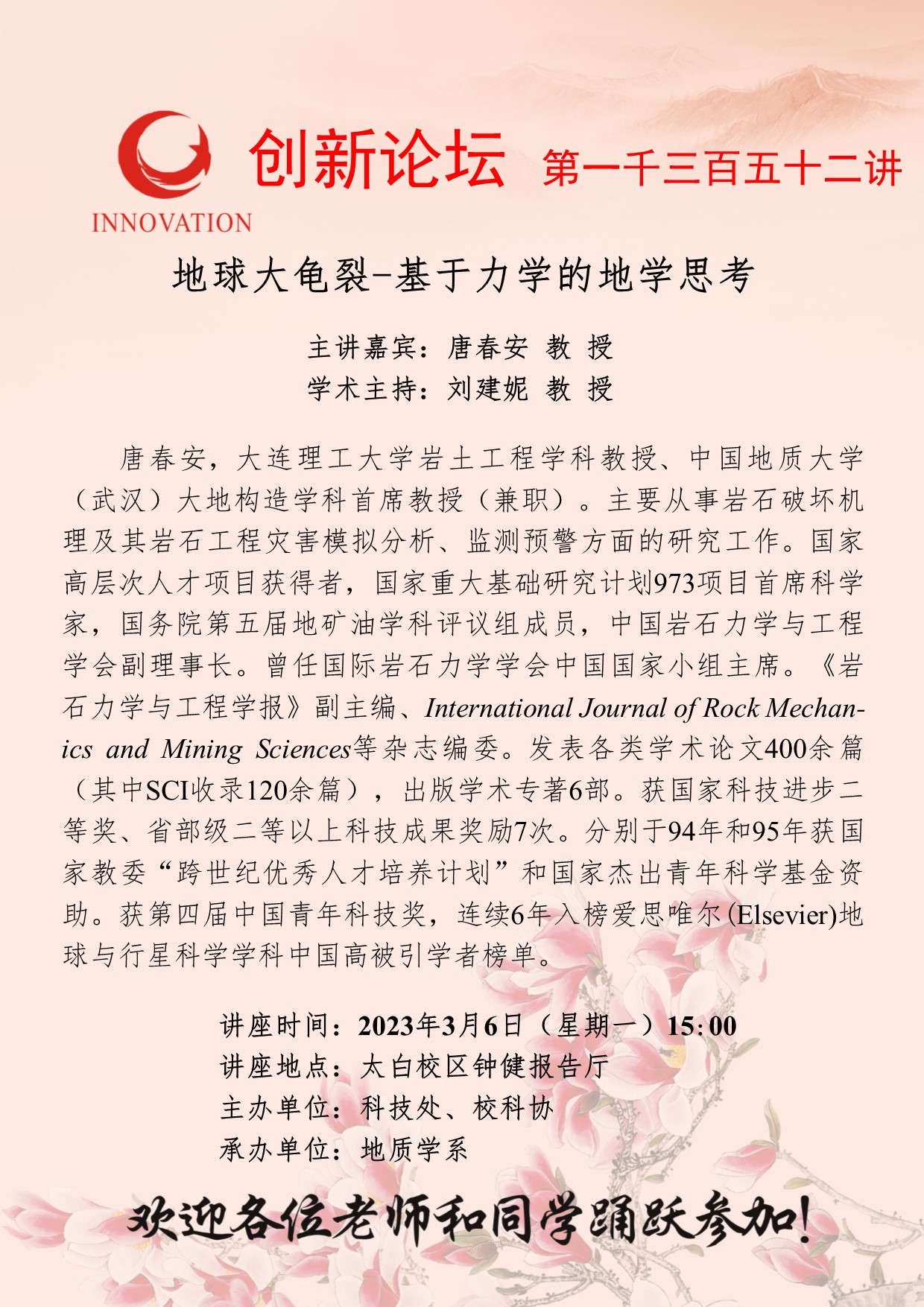 唐春安 教授 星空app官网创新论坛第一千三百五十二讲:地球大龟裂-基于力学的地学思考 讲座时间 2023年3月6日(星期一)15:00 讲座地点 太白校区钟健报告厅 讲座人介绍 唐春安 教授 讲座内容