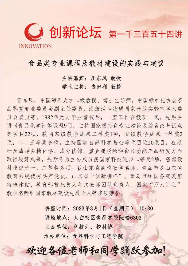 汪东风 教授 星空app官网创新论坛第一千三百五十四讲:食品类专业课程及教材建设的实践与建议 讲座时间 2023年3月1日(星期三) 10:30 讲座地点 太白校区食品学院院楼6303 讲座人介绍 汪东风 教授 讲座内容