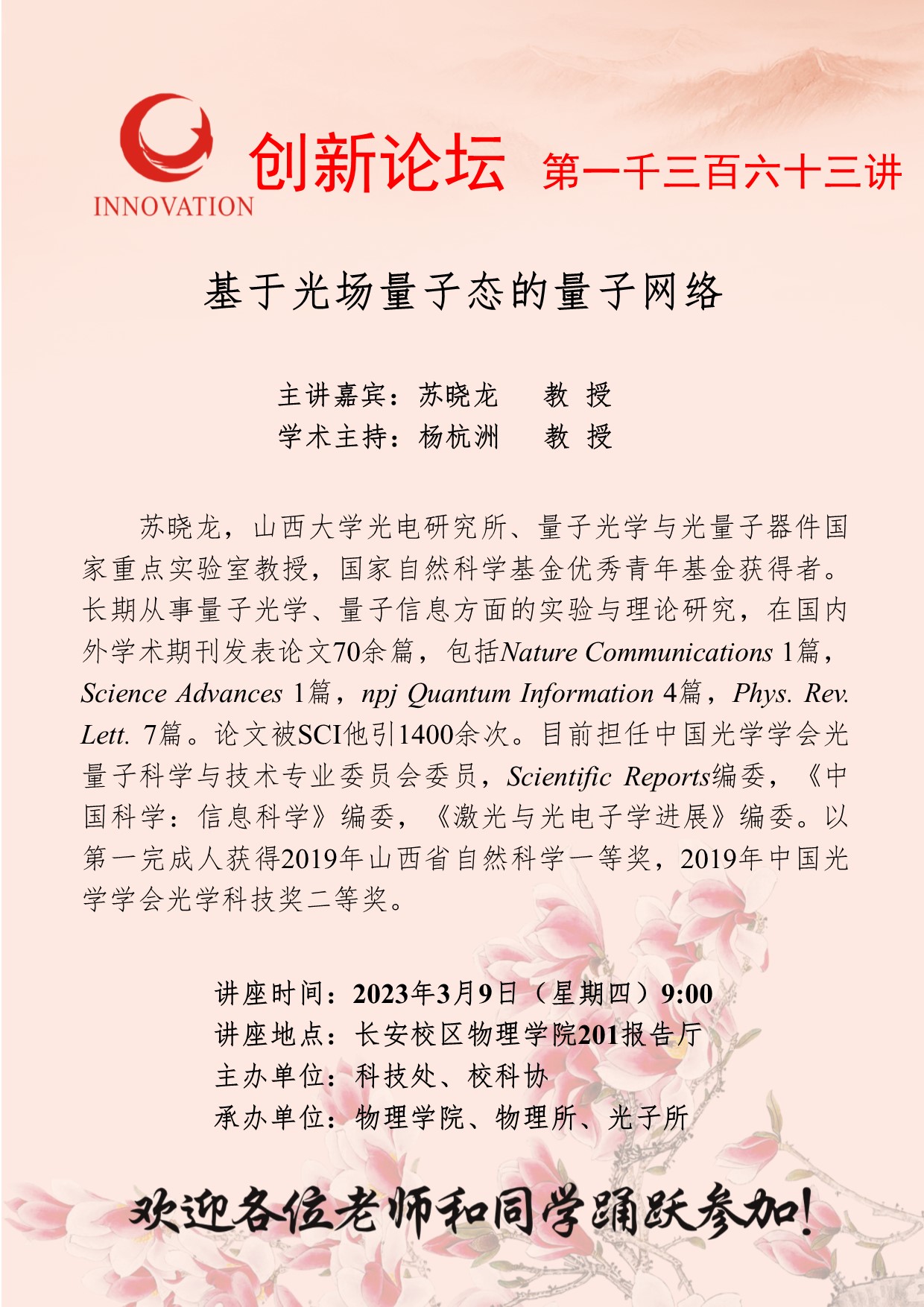苏晓龙 教授 星空app官网创新论坛第一千三百六十三讲:基于光场量子态的量子网络 讲座时间 2023年3月9日(星期四)9:00 讲座地点 长安校区物理学院201报告厅 讲座人介绍 苏晓龙 教授 讲座内容